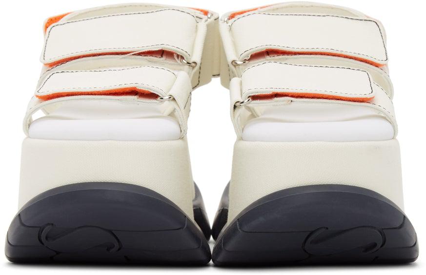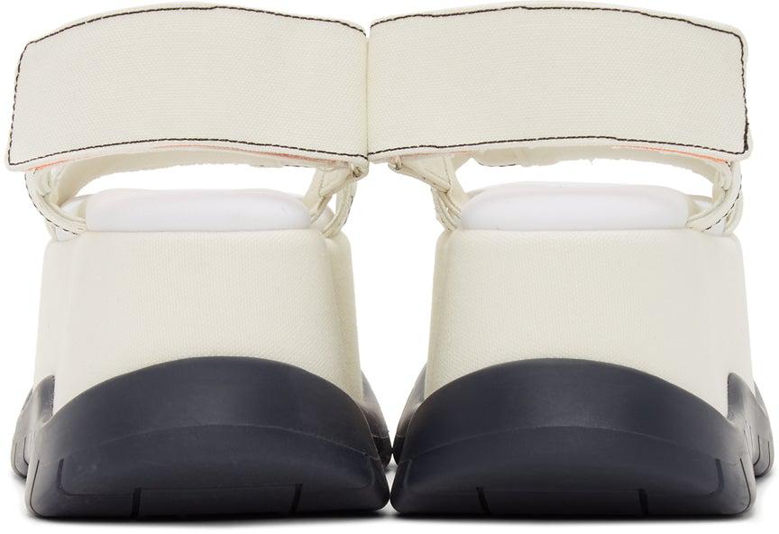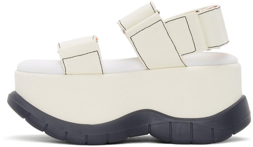 Canvas sandals in off-white. Open round toe. Adjustable Velcro straps at vamp and ankle. Logo printed in off-white at white padded footbed. Tonal covered platform midsole. Treaded rubber outsole in black. Silver-tone hardware. Contrast stitching in black. Approx. 3.5 platform. Supplier color: White Upper: textile. Sole: rubber. Brand: Sunnei