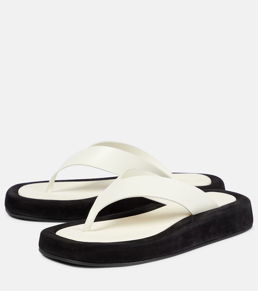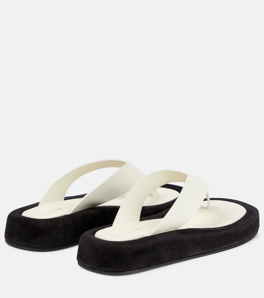 Upper: leather. Lining: leather. Sole: leather insole, rubber sole. Toe shape: round open toe. Made in Italy. Includes: shoe box. Designer color name: Natural - Black. Trim: leather (suede). Shop the latest The Row Flat Sandals for women now.