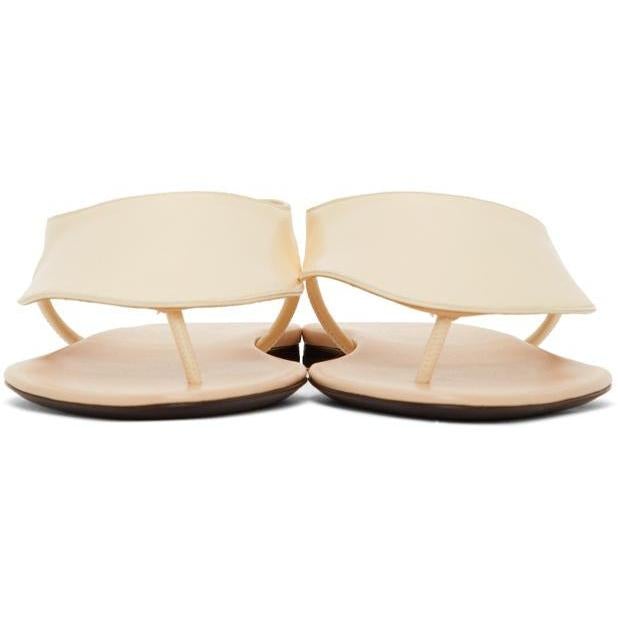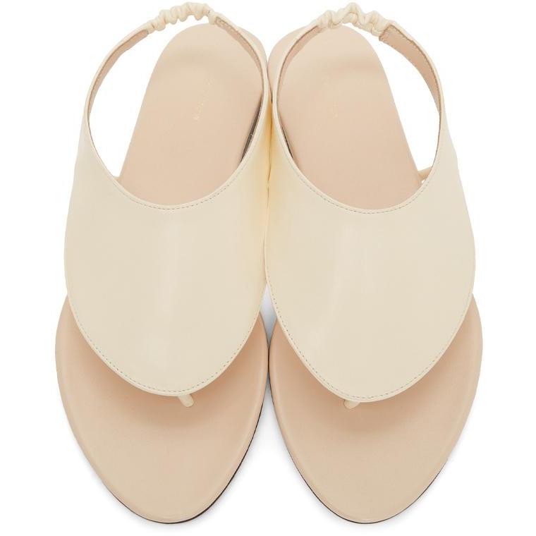 Buffed kidskin sandals in off-white. Open round toe. Elasticized slingback strap. Logo stamped in gold-tone at pink buffed leather footbed. Leather sole in brown. Supplier color: Ivory Upper: kidskin. Sole: leather. Brand: The Row