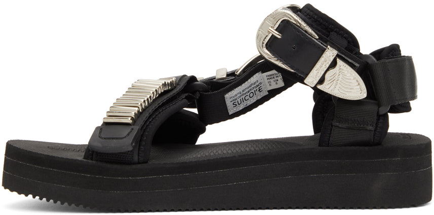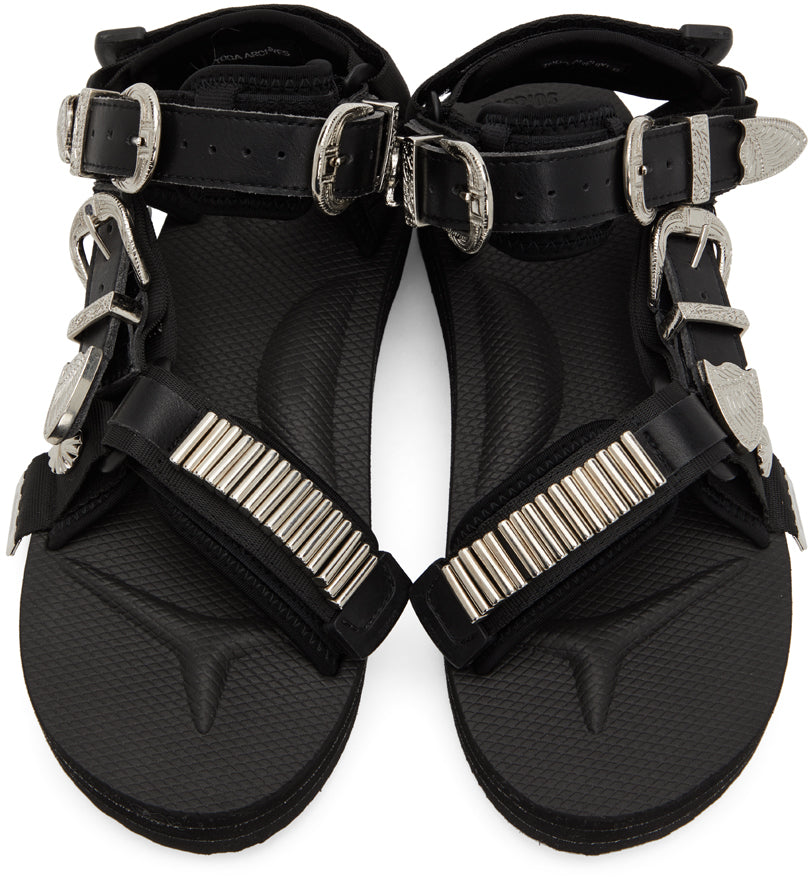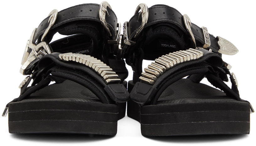 Faux-leather sandals in black. Signature engraved hardware throughout. Open round toe. Adjustable padded straps with pin-buckle and Velcro fastening at vamp. Logo embossed at tonal molded footbed. Tonal bonded jersey lining. Tonal foam rubber midsole. Treaded rubber outsole. Silver-tone hardware. Part of the Toga x Suicoke collaboration. Supplier color: Black Upper: textile, synthetic. Sole: rubber. Brand: Toga