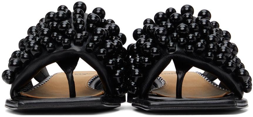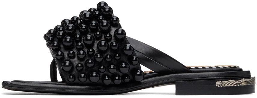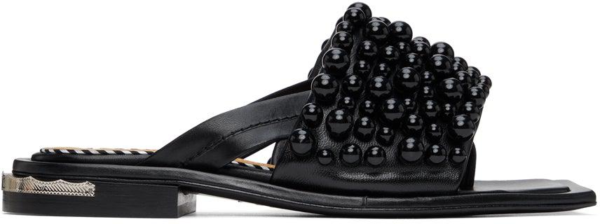 Buffed leather slip-on sandals in black. Open square toe. Partially concealed thong-style strap. Padded strap with tonal beaded accents at vamp. Logo stamp in black at padded beige leather footbed. Signature engraved plaque at stacked leather heel. Tonal leather outsole. Black and silver-tone hardware. Supplier color: Black Leather. Brand: Toga Pulla