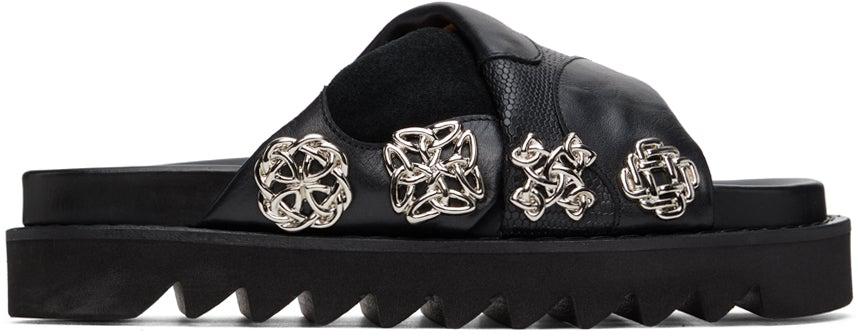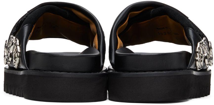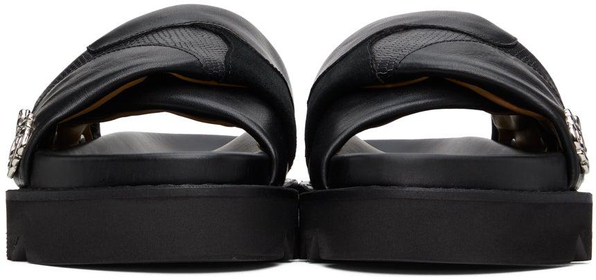 Paneled buffed leather, embossed leather, and suede slip-on sandals in black. Open round toe. Criss-crossing straps at vamp. Graphic hardware detailing at outer side. Silver-tone logo stamp at molded rubber footbed. Tonal treaded platform foam rubber sole. Silver-tone hardware. Approx. 1.5 platform. Supplier color: Black Upper: leather. Sole: rubber. Brand: Toga Pulla