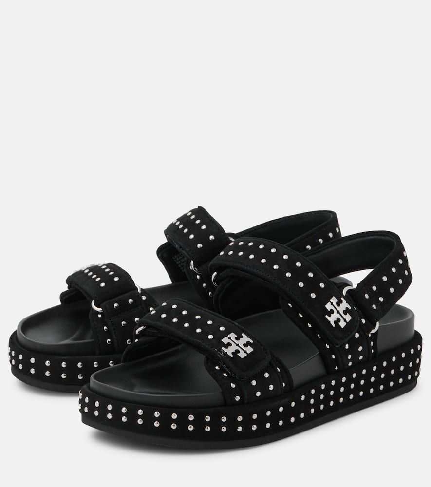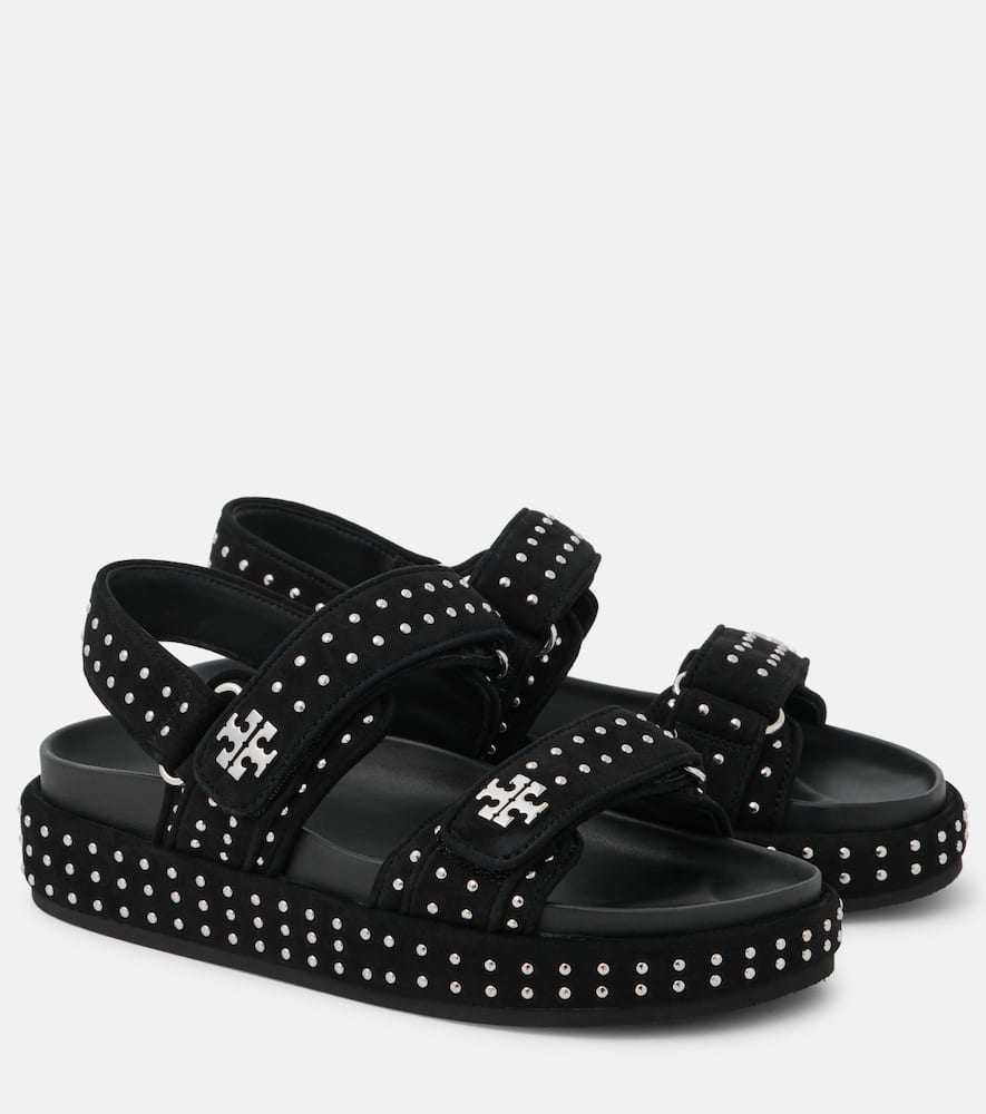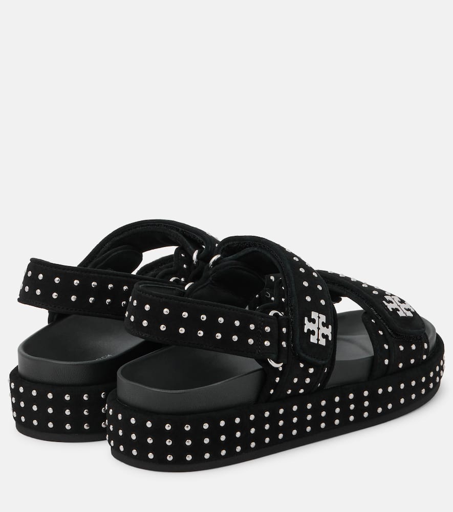 Upper: leather. Lining: leather. Sole: leather insole, rubber sole. Toe shape: round open toe. Made in Vietnam. Includes: shoe box, dust bag. Designer color name: Perfect Black / Silver. Shop the latest Tory Burch Flat Sandals for women now.
