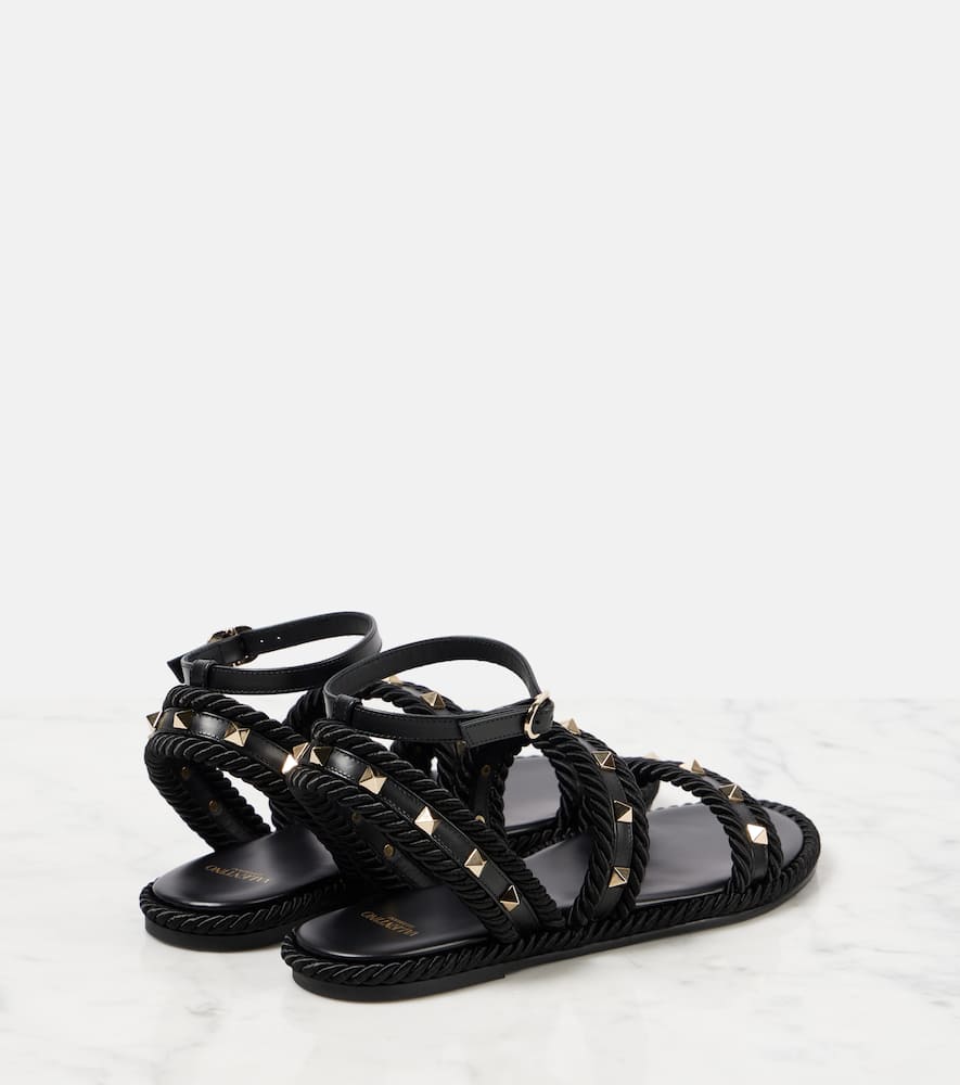 Upper: fabric. Lining: fabric. Sole: leather insole, rubber sole. Toe shape: round open toe. Made in Italy. Includes: shoe box, dust bags. Designer color name: Nero. Trim: leather. Hardware color: gold. Closure: buckle-fastening ankle strap. Shop the latest Valentino Garavani Flat Sandals for women now.