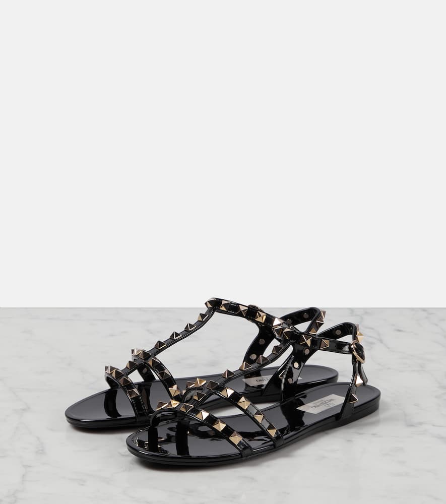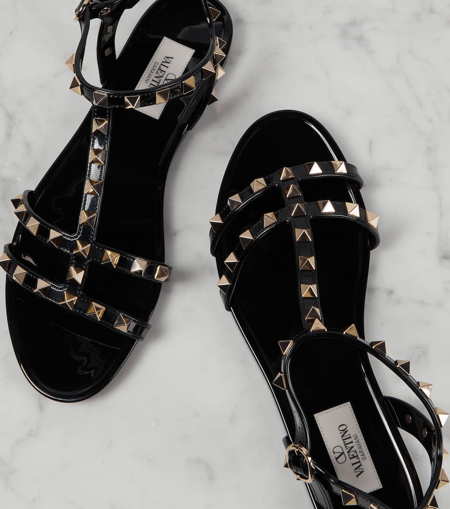 Toe shape: round open toe. Trim: platinum-plated studs. Designer color name: Black. Closure: buckle-fastening ankle strap. Made in Italy. Shop the latest Valentino Garavani Flat Sandals for women now.