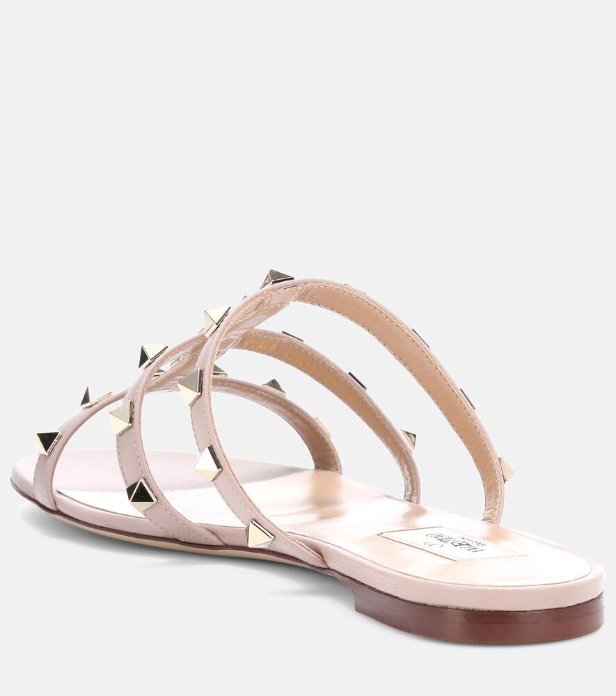 Toe shape: round open toe. Lining: leather. Sole: leather insole and sole. Upper: lamb leather. Trim: platinum-plated studs. Designer color name: Poudre. Made in Italy. Shop the latest Valentino Garavani Flat Sandals for women now.