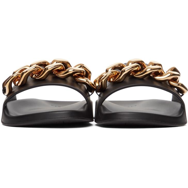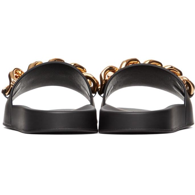 Buffed leather slip-on sandals in black. Open round toe. Curb chain and signature Medusa hardware at strap. Logo embossed at tonal molded rubber footbed. Tonal rubber sole. Gold-tone hardware. Supplier color: Black Upper: leather. Sole: rubber. Brand: Versace