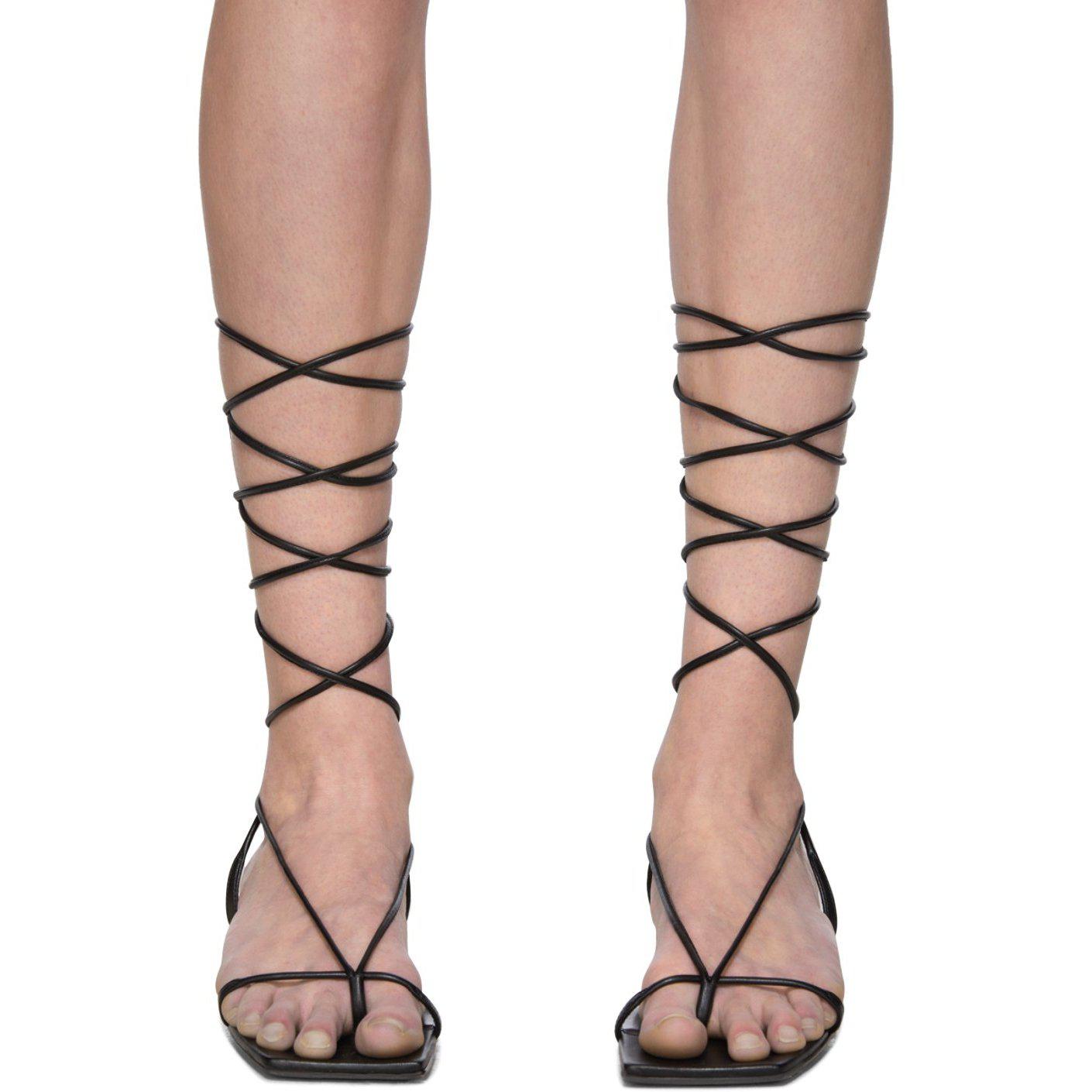 Leather sandals in black. Open square toe. Criss-crossing leather straps at vamp. Wraparound self-tie leather ankle straps. Tonal leather footbed. Tonal leather sole. Supplier color: Black Upper: leather. Sole: leather. Brand: Versace