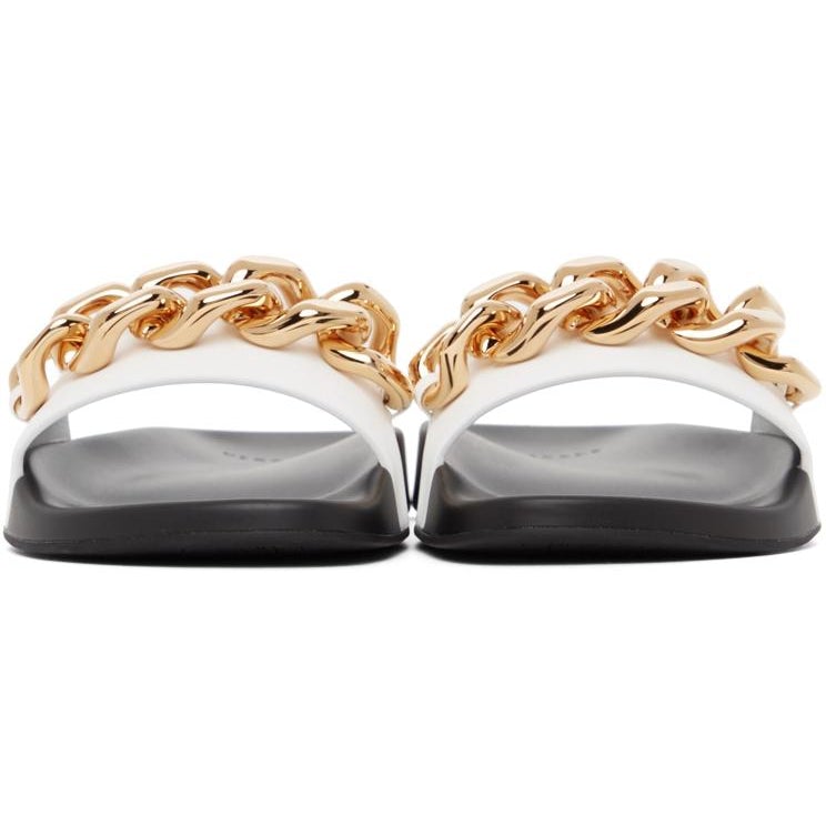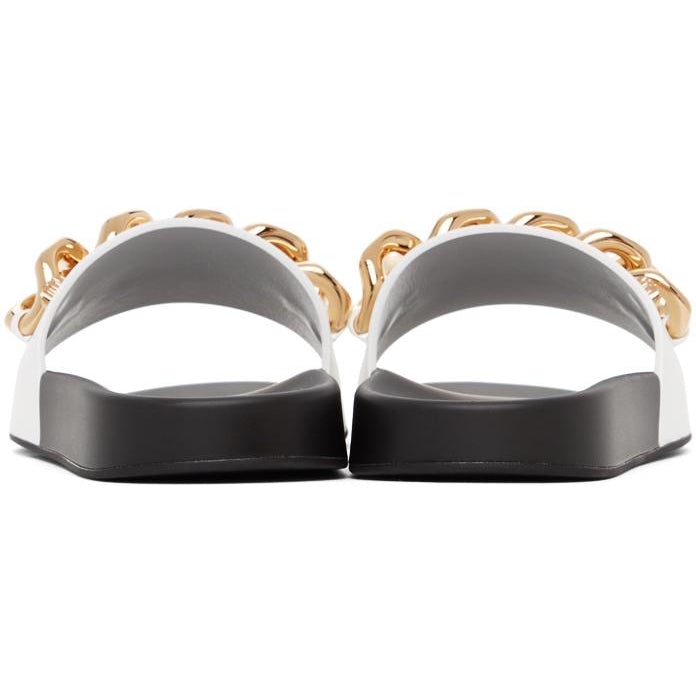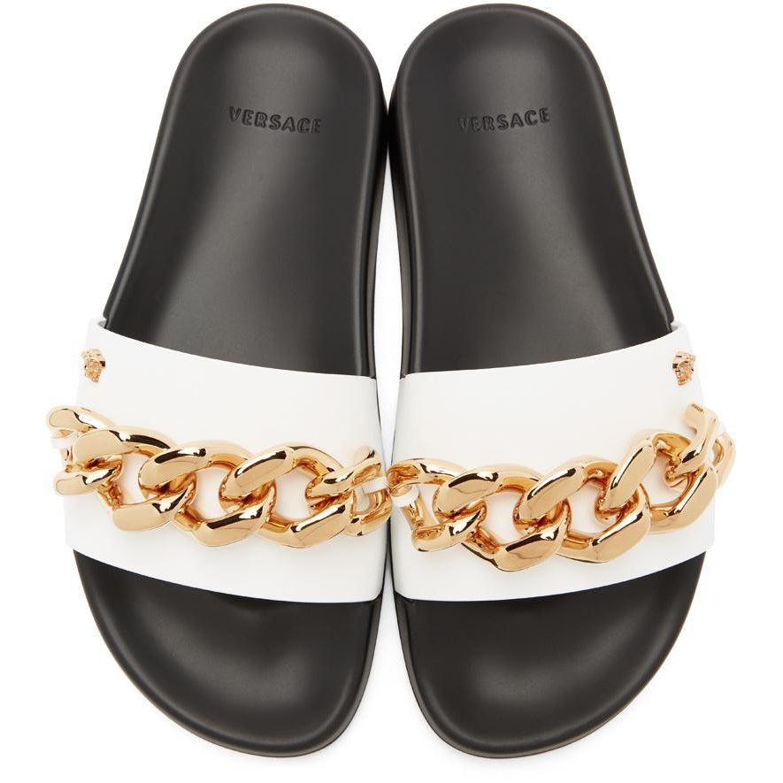 Buffed leather slip-on sandals in white. Open round toe. Curb chain and signature Medusa hardware at strap. Logo embossed at black molded rubber footbed. Rubber sole in black. Gold-tone hardware. Supplier color: White Upper: leather. Sole: rubber. Brand: Versace