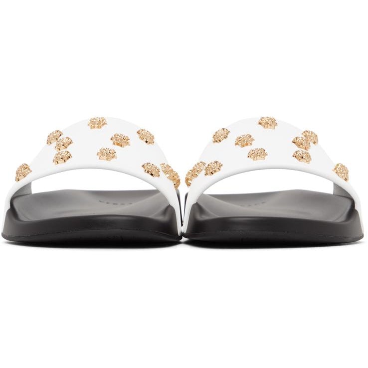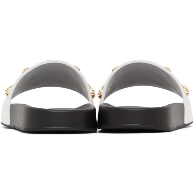 Buffed leather slip-on sandals in white. Open round toe. Studded signature Medusa hardware at strap. Logo embossed at molded black rubber footbed. Rubber sole in black. Gold-tone hardware. Supplier color: White Upper: leather. Sole: rubber. Brand: Versace