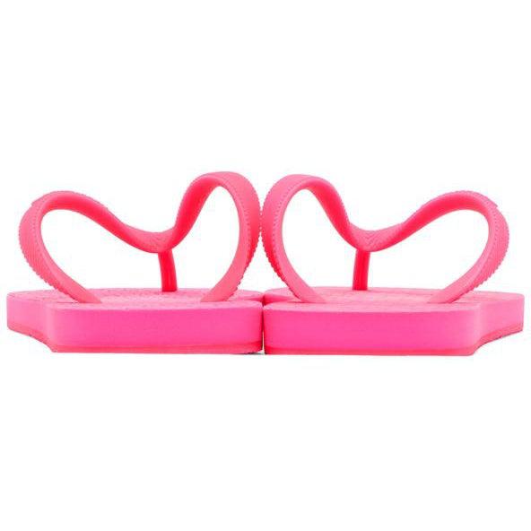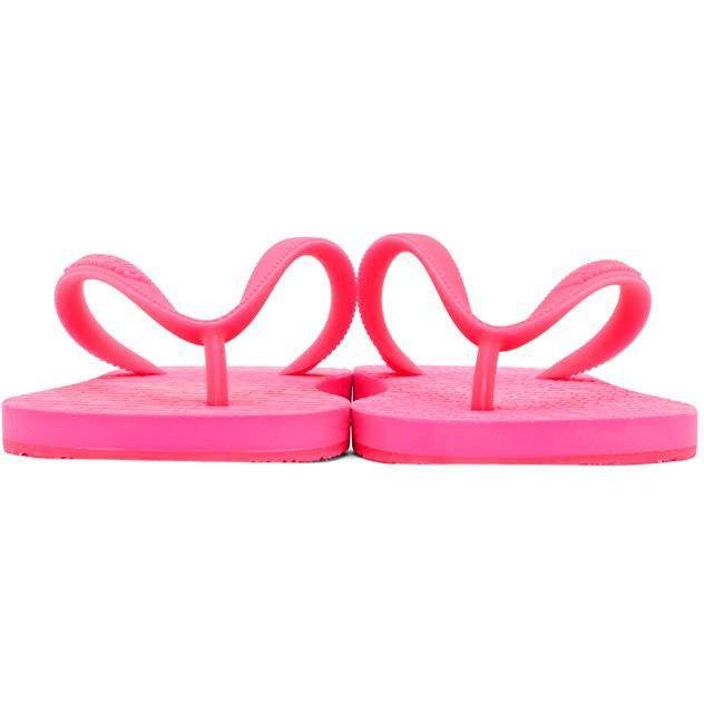 Rubber slip-on sandals in pink. Open round toe. Tonal logo embossed at ribbed vamp. Logo pattern embossed at foam rubber footbed. Tonal rubber sole. Supplier color: Hot pink Rubber. Brand: VETEMENTS