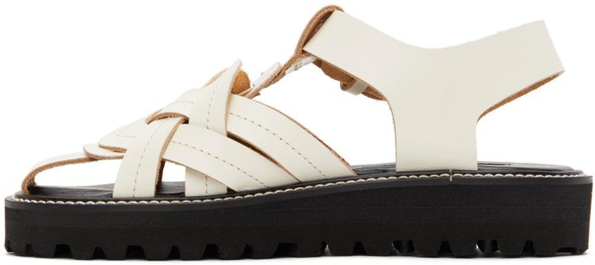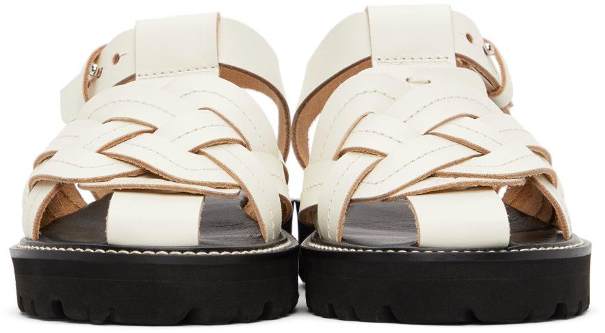 Buffed leather sandals in white. Open round toe. Braided leather straps at vamp. Adjustable ankle strap with post-stud fastening. Tonal textile logo flag at buffed leather footbed. EVA foam rubber midsole in black. Treaded Vibram® rubber outsole in black. Silver-tone hardware. Supplier color: White Upper: leather. Sole: rubber. Brand: Y's