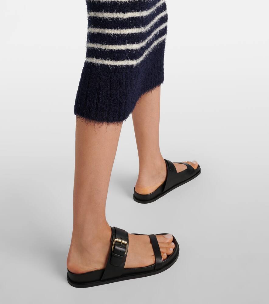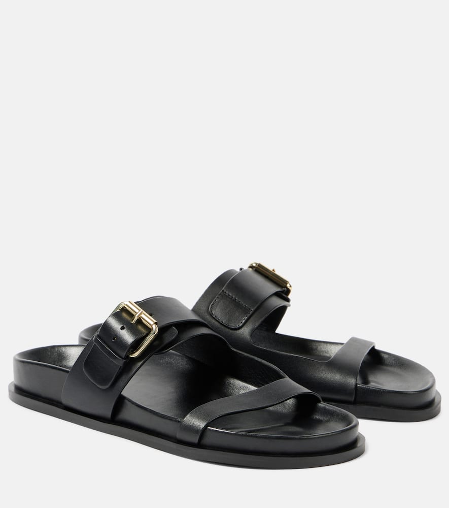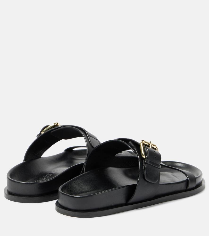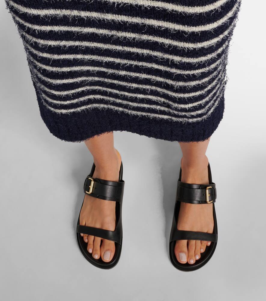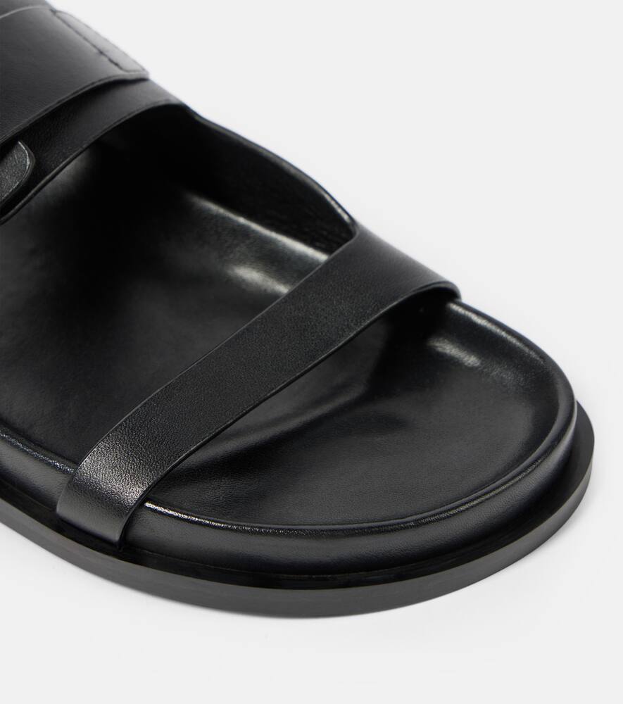 Upper: goat leather. Lining: leather. Sole: leather insole, rubber sole. Toe shape: round open toe. Made in India. Includes: shoe box. Designer color name: Black. Shop the latest A.Emery Flat Sandals for women now.