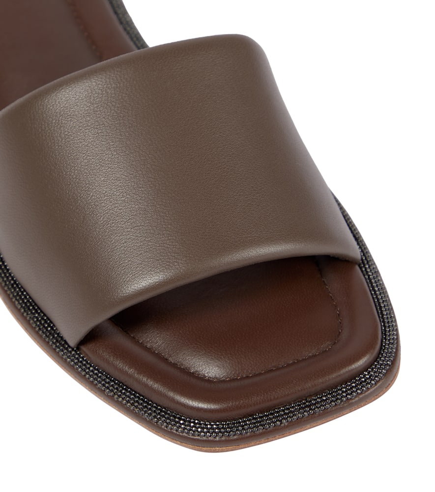 Sole: leather insole, rubber sole. Upper: lamb leather. Toe shape: square open toe. Made in Italy. Lining: lamb leather. Designer color name: Brown. Shop the latest Brunello Cucinelli Flat Sandals for women now.