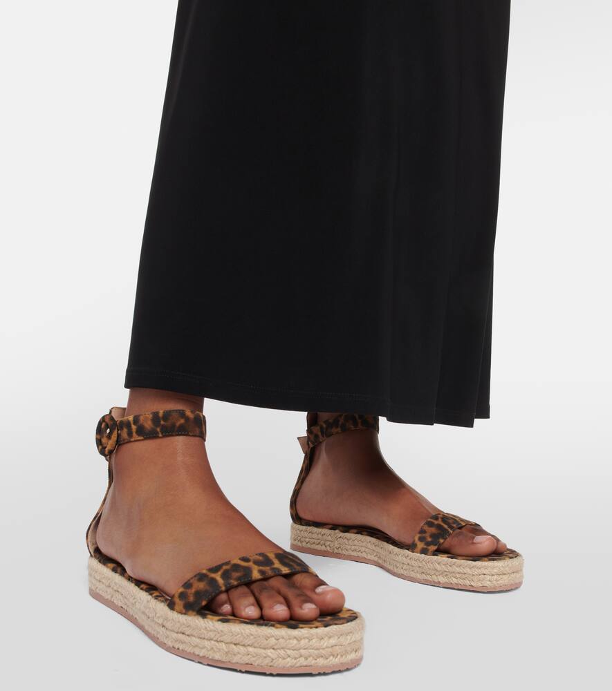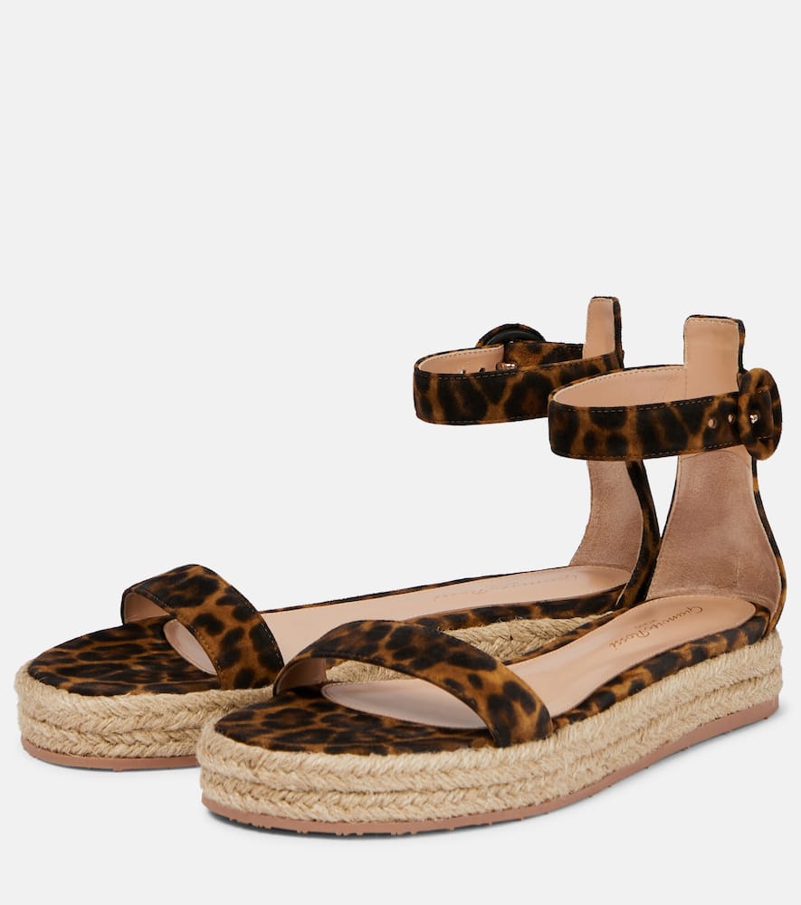 Toe shape: round open toe. Trim: jute. Sole: leather insole, rubber sole. Comes with dust bag. Designer color name: Leopard Suede. Upper: goat leather. Comes with a box. Closure: buckle-fastening ankle strap. Made in Italy. Shop the latest Gianvito Rossi Flat Espadrilles for women now.