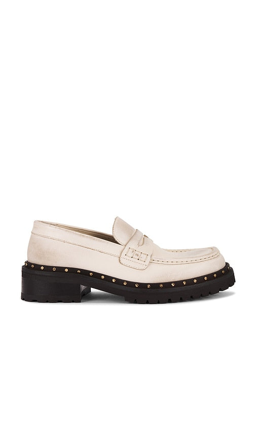Leather upper with manmade sole. Made in Italy. Slip-on styling. Leather footbed and lining. Signature penny loafer strap. Gold-tone studded trim. Intentionally scuffed. Approx 40mm/ 1.5 inch heel. GGOR-WZ648. GWF00782.F006919.11732. From Italy to the skateparks of Los Angeles, Golden Goose has become a world-renowned high fashion brand for luxury sneakers. Hand crafted on premium Italian leather; Golden Goose has successfully combined the relaxed vintage aesthetic with their unique 'lived in' touch. Their signature pre-scuffed style (each distressed by hand) offers a nonchalant attitude that embodies 'perfect imperfection' for a touch of life, comfort and fashion forward designs. Color: Butter. Shop Butter Loafers & Oxfords Flats for women and the latest Golden Goose shoes now.