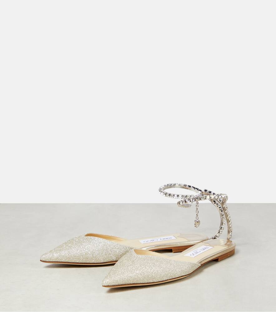 Lining: leather. Upper: fabric. Sole: leather insole and sole. Toe shape: pointed toe. Closure: ankle strap. Designer color name: Platinum Ice/Crystal. Comes with dust bags. Comes with a box. Made in Italy. Shop the latest Jimmy Choo Ballet Flats for women now.