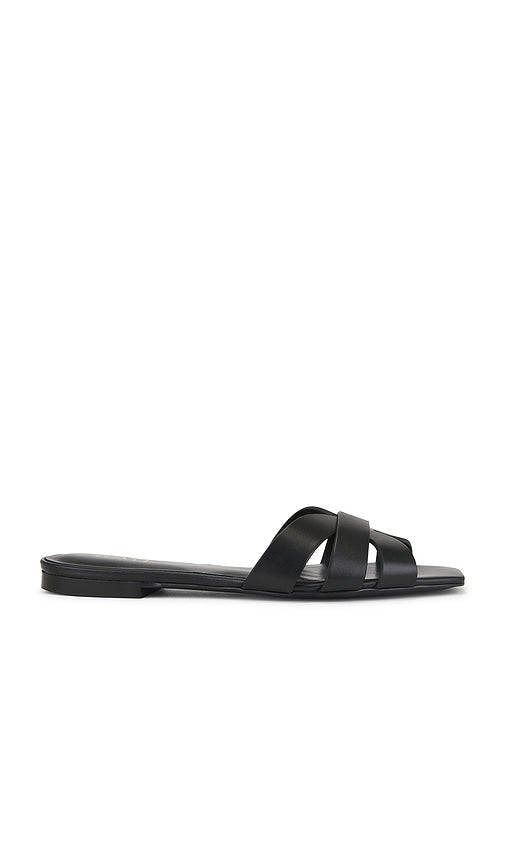 Smooth leather upper with manmade sole. Slip-on styling. Cushioned leather footbed. Square toe. RAYE-WZ2849. RYSH1959 S25. Inspired by the word Reina, the Spanish word for queen, Raye is the queen bee shoe brand that will surely capture your heart. With an extensive assortment of silhouettes from heels to boots and sandals to flats, Raye has that perfect something for everyone. Color: Black. Shop Black Flat Sandals for women and the latest RAYE shoes now.