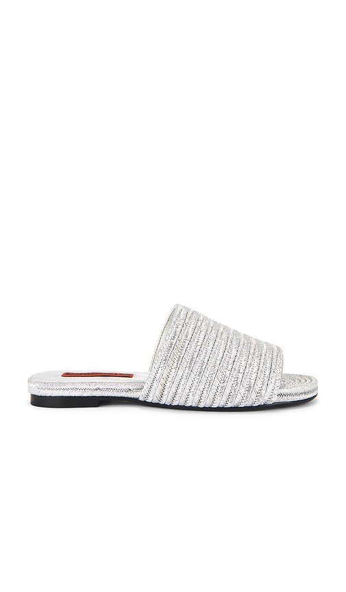Metallic raffia upper with manmade sole. Slip-on styling. Faux leather footbed and lining. Rounded toe. SIMO-WZ72. F318-9097. Simon Miller Jeans was founded in 2006 in Los Angeles, California. They strive to provide you with the highest quality denim jeans made right here in the USA. Simon Miller denim is the best quality denim from Japan. The collection consists of selvedge and non-selvedge finishes. The entire production aspect of Simon Miller is based in downtown Los Angeles from the sewing and washing, to the rivets and domes sourced from YKK USA. Color: Silver. Shop Silver Flat Slides for women and the latest SIMONMILLER shoes now.