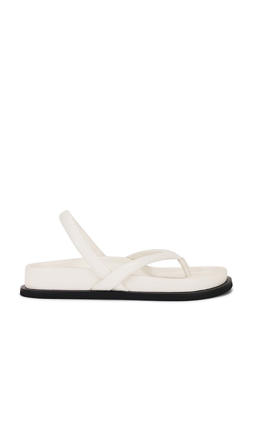 Leather upper with rubber sole. Made in China. Slip-on styling. Contoured leather footbed. Thong styling. SAGN-WZ26. R25-123TFU. Color: Tofu. Shop Tofu Flat Sandals for women and the latest St. Agni shoes now.