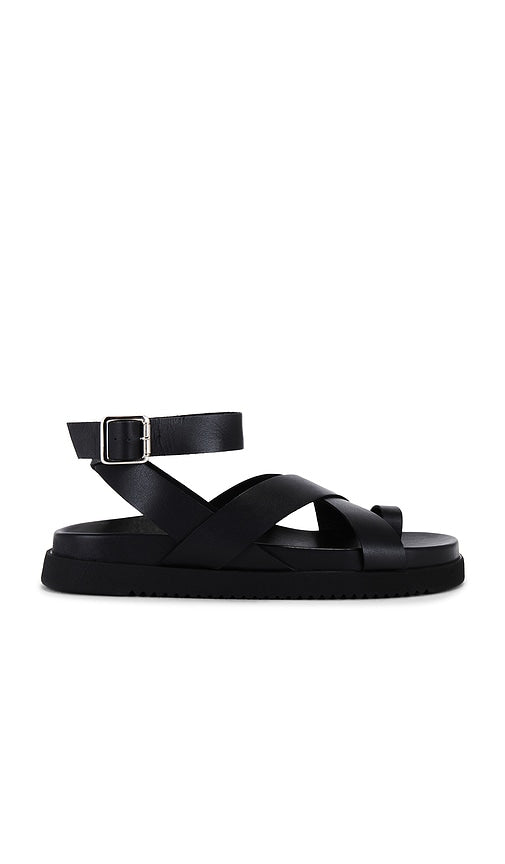 Leather upper with manmade sole. Made in Mexico. Ankle buckle closure. Contoured leather footbed with leather lining. Strappy design. SMAD-WZ1430. MIRA12S1. The effortless west coast vibe of BB Dakota has now merged with the iconic Downtown edge of Steve Madden. Introducing Steve Madden Apparel... Inspired by confident women and its youthful New York City roots, Steve Madden apparel offers bold and disruptive, yet timeless essentials. Always at the forefront of trends and reinventing style season after season, Steve Madden apparel provides you with the tools you need to become your own fashion visionary. It's about authenticity. It's about embracing individuality. It's Steve Madden. Color: Black. Shop Black Flat Sandals for women and the latest Steve Madden shoes now.