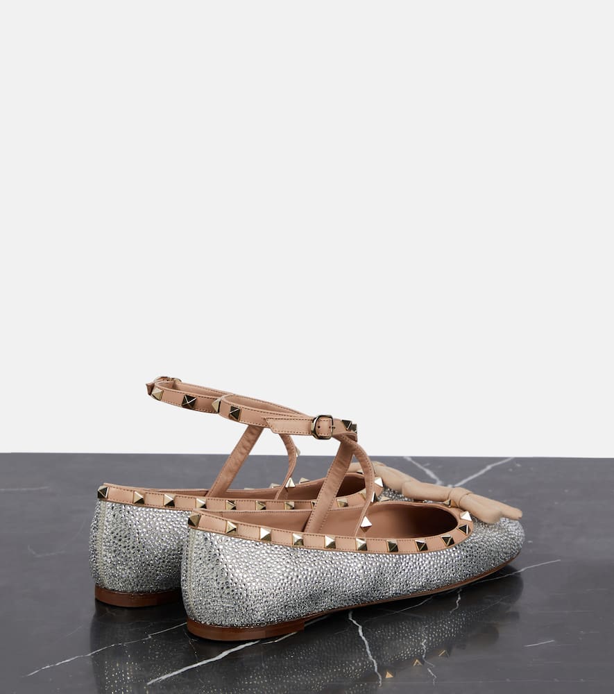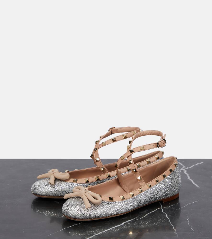 Upper: fabric. Toe shape: round toe. Sole: leather insole and sole. Trim: lamb leather. Designer color name: Crystal/Grigio Perla. Comes with a box. Closure: buckle-fastening ankle strap. Made in Italy. Comes with dust bag. Shop the latest Valentino Garavani Ballet Flats for women now.