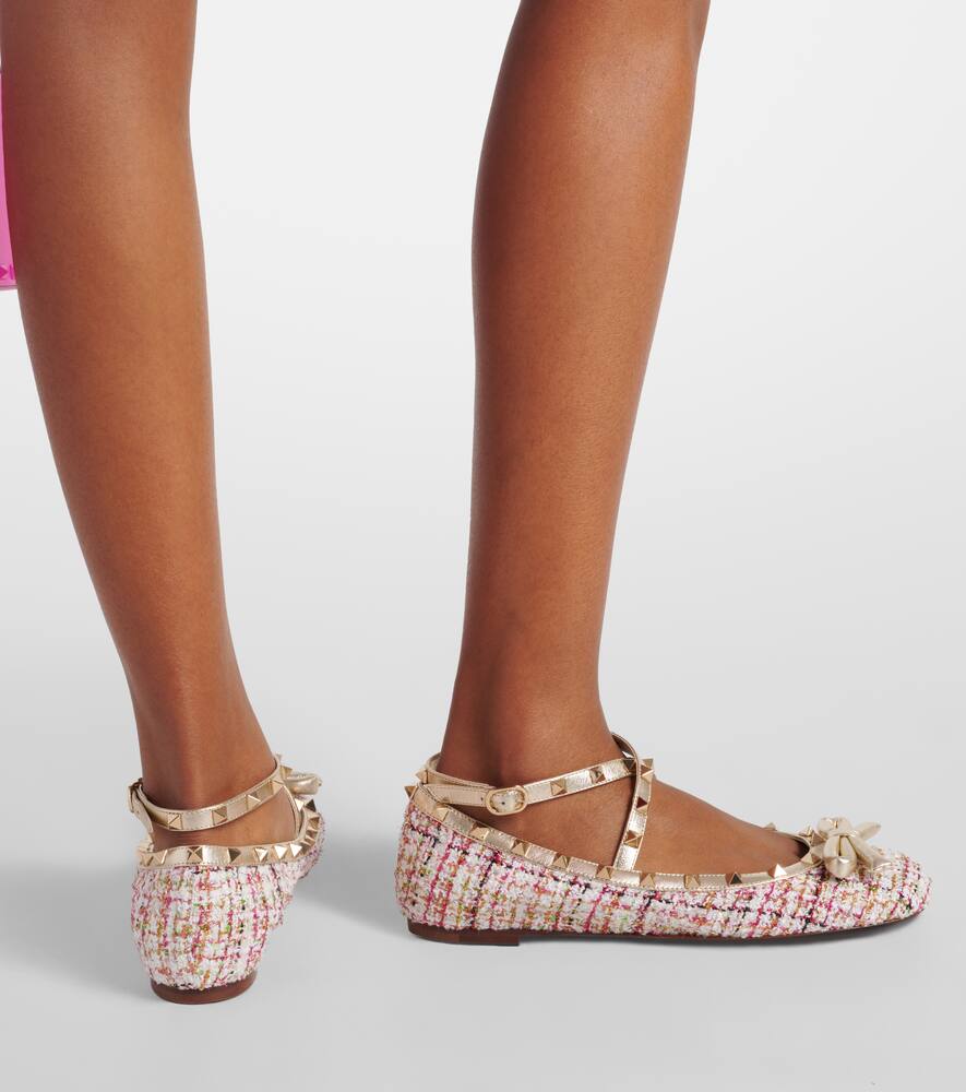 Upper: fabric. Lining: leather. Sole: leather insole and sole. Toe shape: round toe. Made in Italy. Includes: dust bag, shoe box. Designer color name: Multicolor/Platino. Trim: leather. Closure: buckle-fastening ankle strap. Shop the latest Valentino Garavani Ballet Flats for women now.