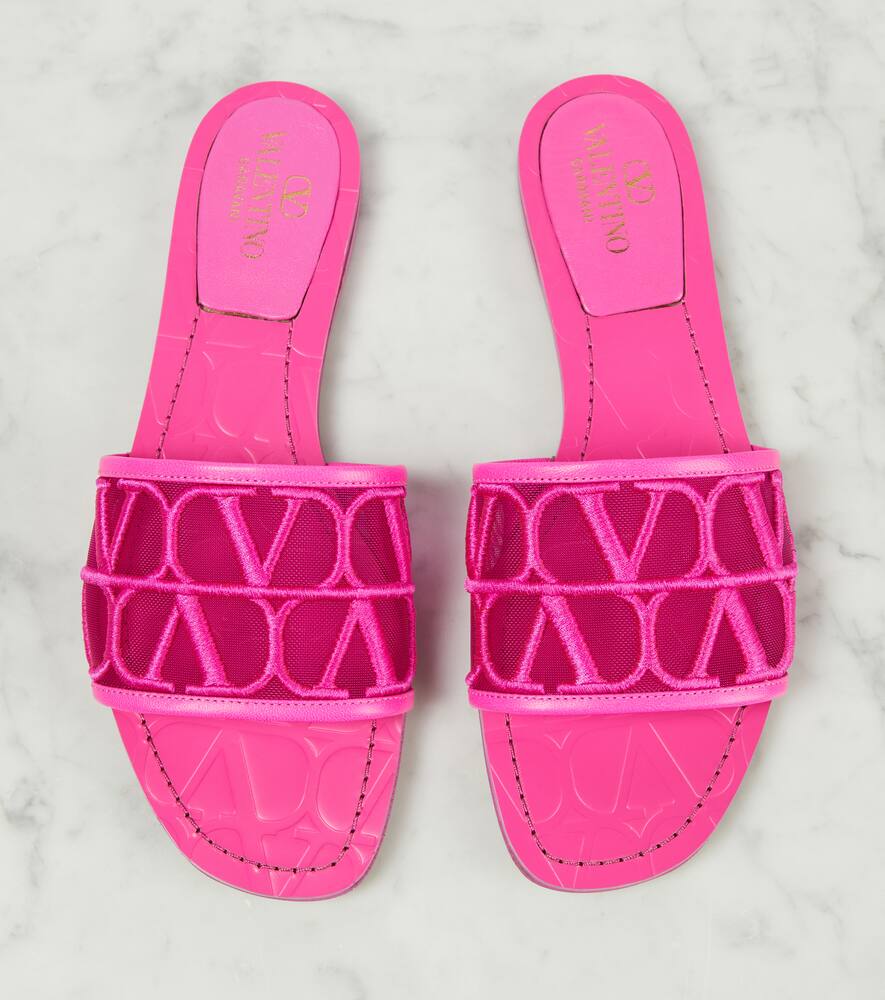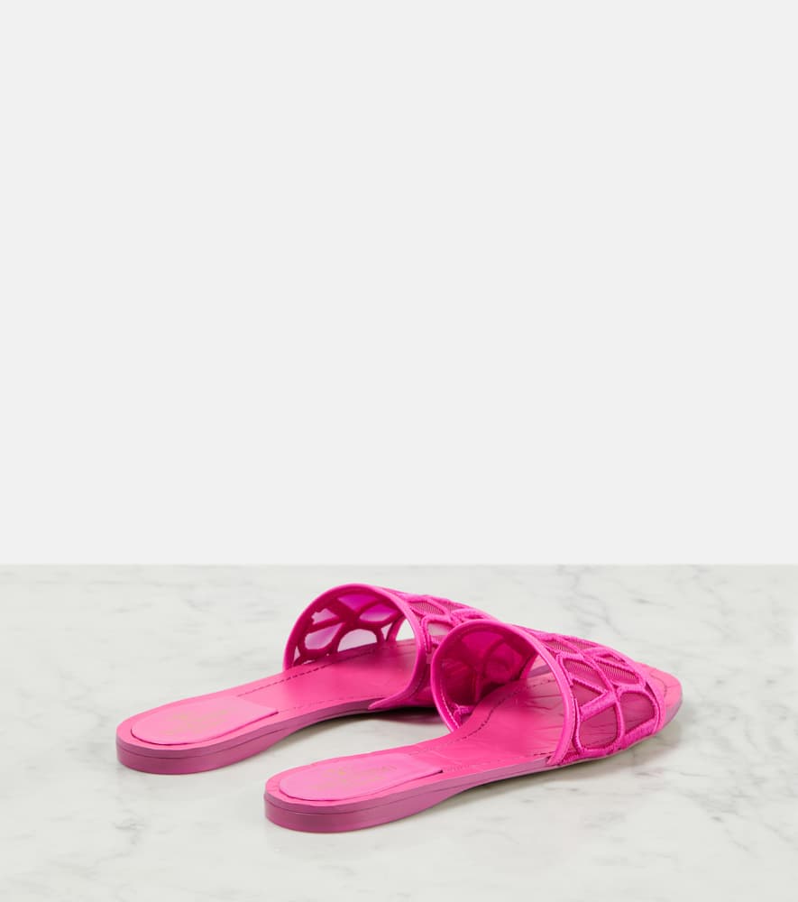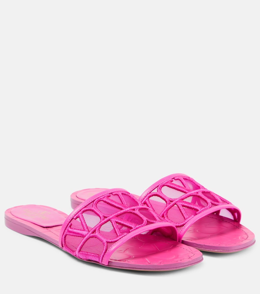 Upper: fabric. Lining: fabric. Sole: leather insole and sole. Toe shape: square open toe. Made in Italy. Includes: dust bags, shoe box. Designer color name: Pink Pp. Trim: leather. Shop the latest Valentino Garavani Flat Sandals for women now.