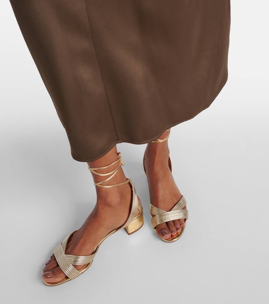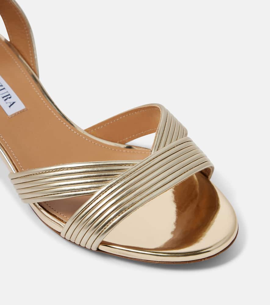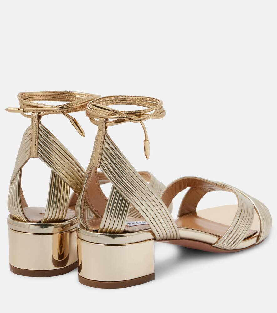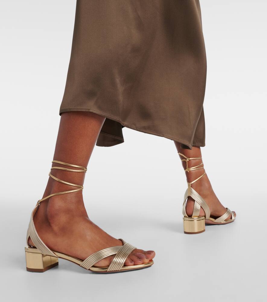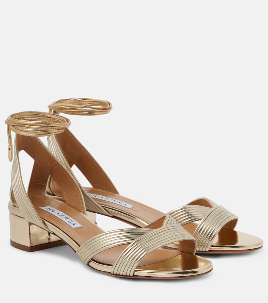 Upper: leather. Lining: leather. Sole: leather insole, leather and rubber sole. Toe shape: almond open toe. Made in Italy. Includes: shoe box, dust bag. Designer color name: Light Gold. Shop the latest Aquazzura Mid-Heel Sandals for women now.