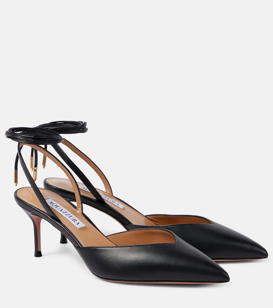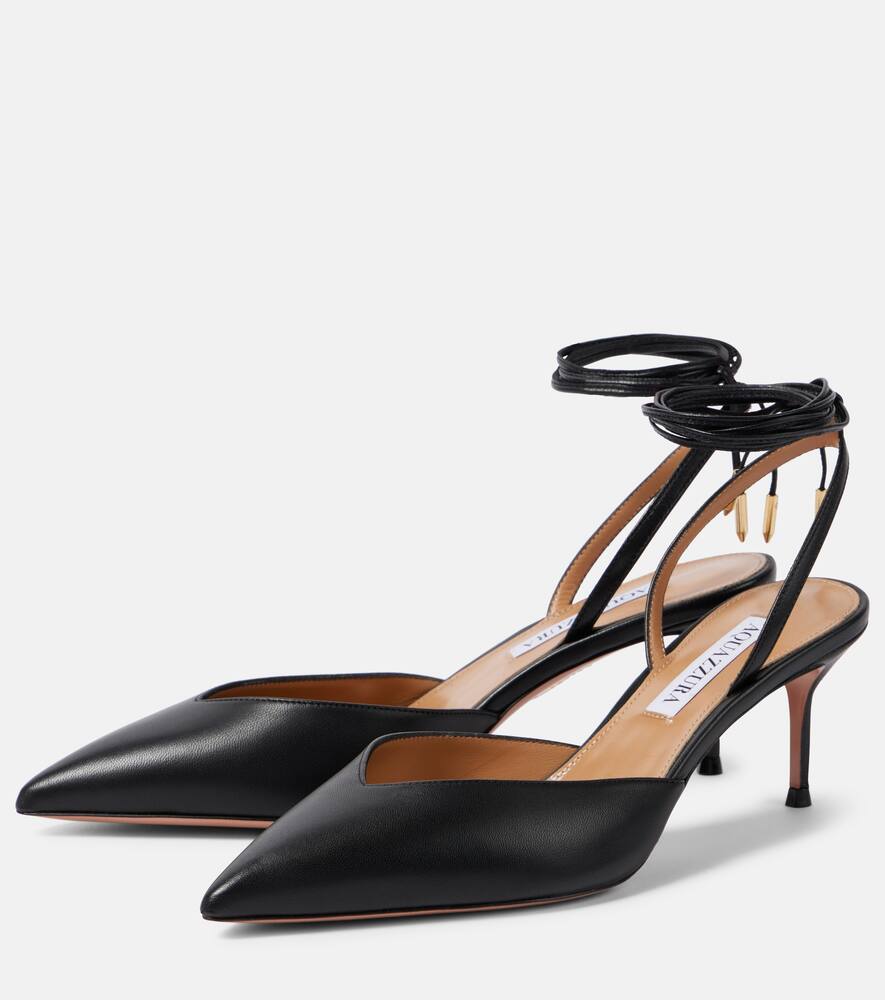 Upper: leather. Lining: leather. Sole: leather insole and sole. Toe shape: pointed toe. Made in Italy. Includes: dust bag, shoe box. Designer color name: Black. Closure: ankle strap. Shop the latest Aquazzura Mid-Heel Pumps for women now.
