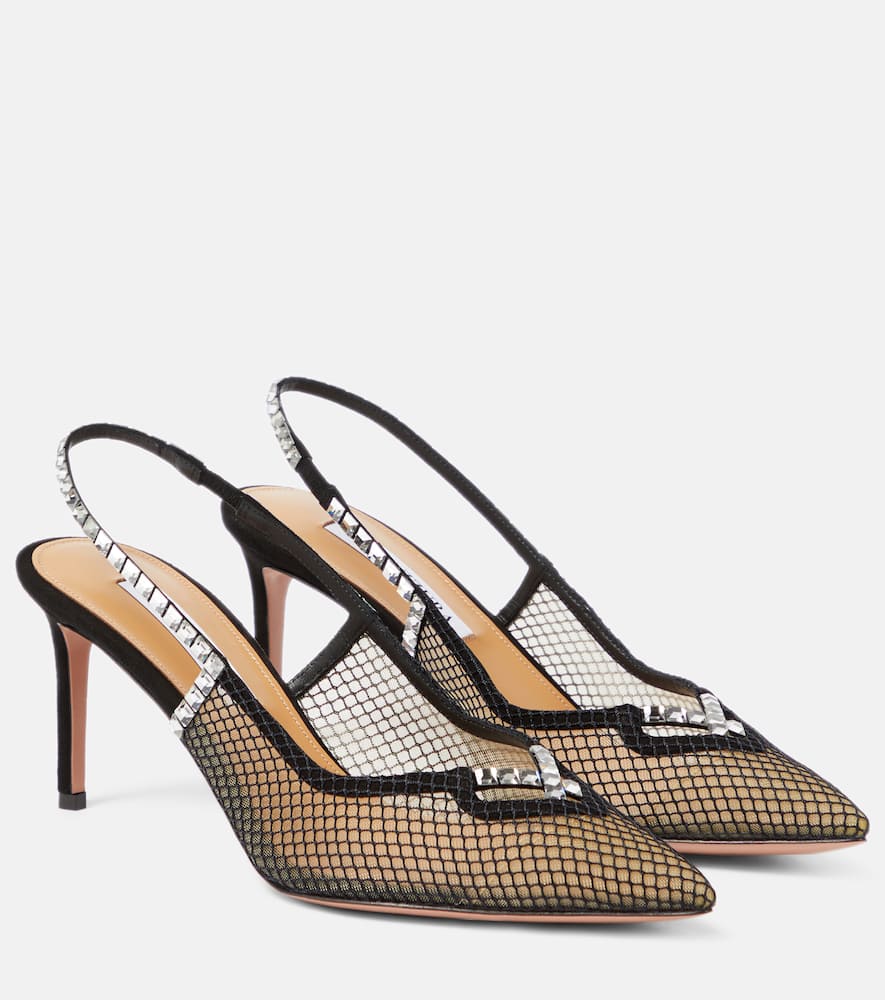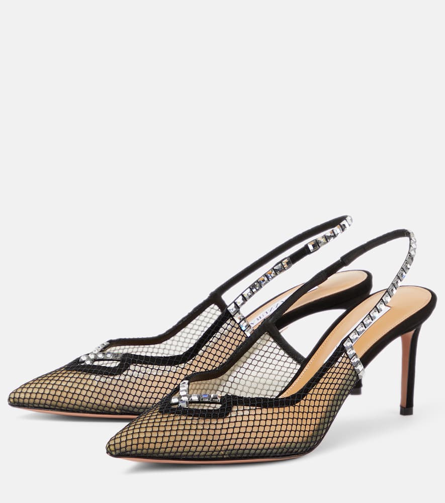 Upper: fabric. Lining: leather. Sole: leather insole and sole. Toe shape: pointed toe. Made in Italy. Includes: shoe box, dust bag. Designer color name: Black. Closure: ankle strap. Shop the latest Aquazzura Mid-Heel Pumps for women now.