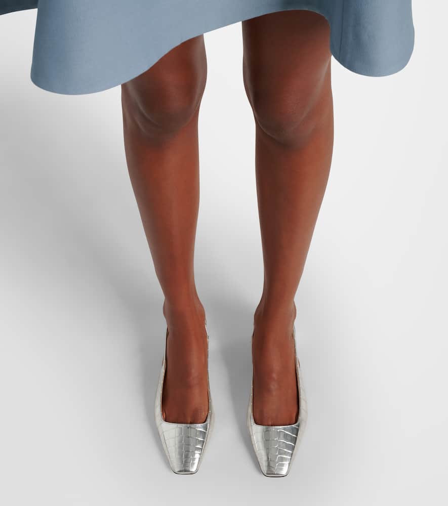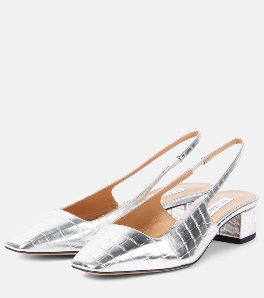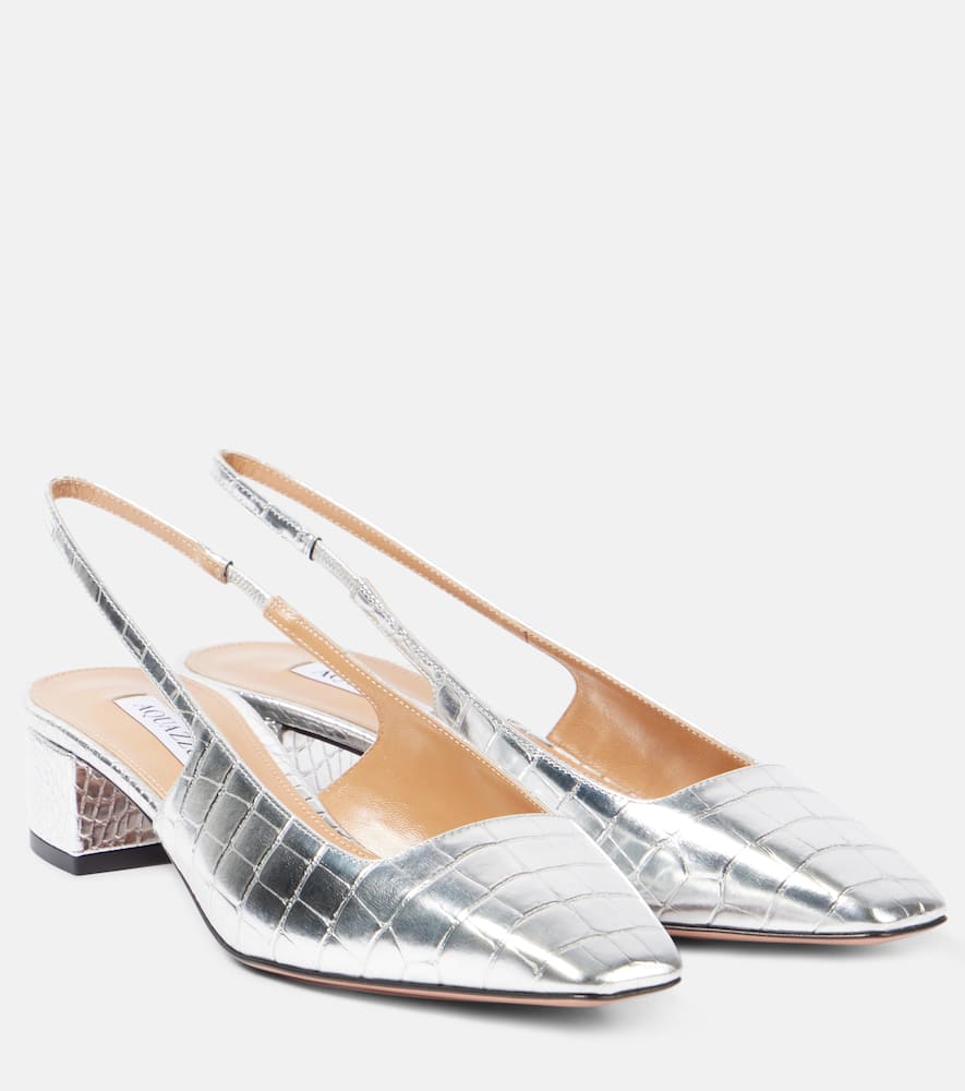 Upper: leather. Lining: leather. Sole: leather insole and sole. Toe shape: square toe. Made in Italy. Includes: shoe box, dust bag. Designer color name: Silver. Closure: ankle strap. Shop the latest Aquazzura Mid-Heel Pumps for women now.