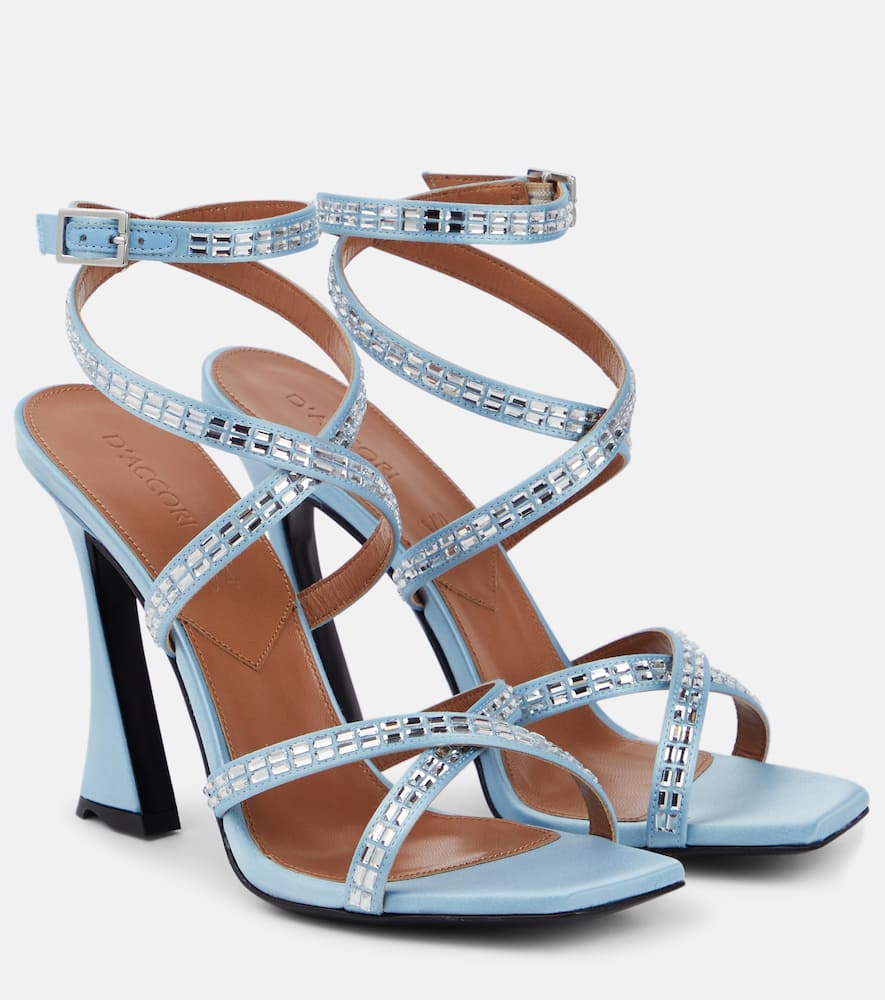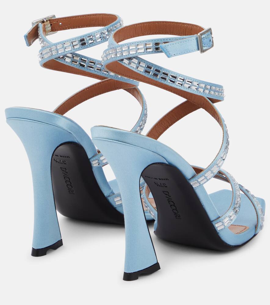 Upper: fabric. Lining: leather. Sole: leather insole and sole. Toe shape: square open toe. Made in Italy. Includes: shoe box. Designer color name: Powder Blue. Closure: buckle-fastening ankle strap. Shop the latest D'Accori High-Heel Sandals for women now.