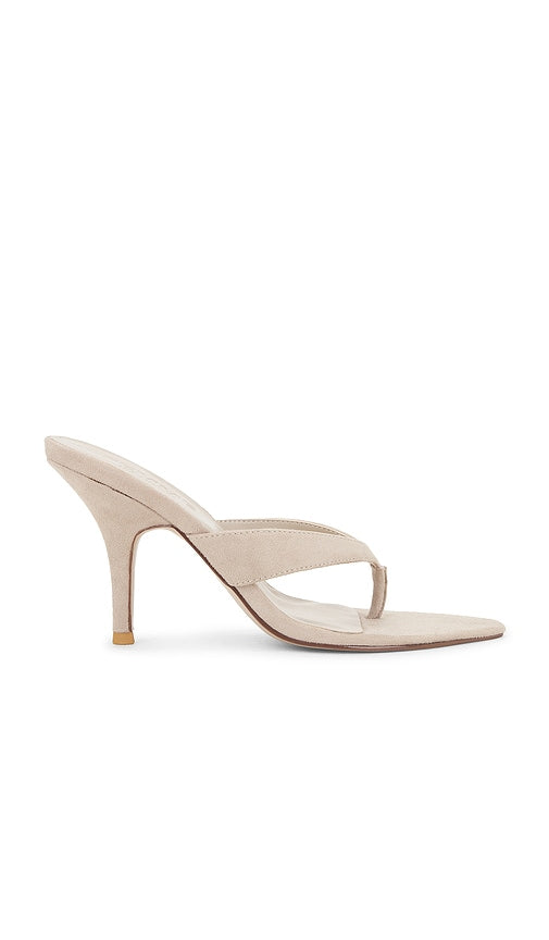 Faux suede upper with manmade sole. Made in China. Slip-on styling. Faux leather footbed and lining. Pointed toe. Approx 95mm/ 3.75 inch heel. FELA-WZ136. TOKYO. Color: Nude. Shop Nude Heeled Sandals for women and the latest FEMME LA shoes now.