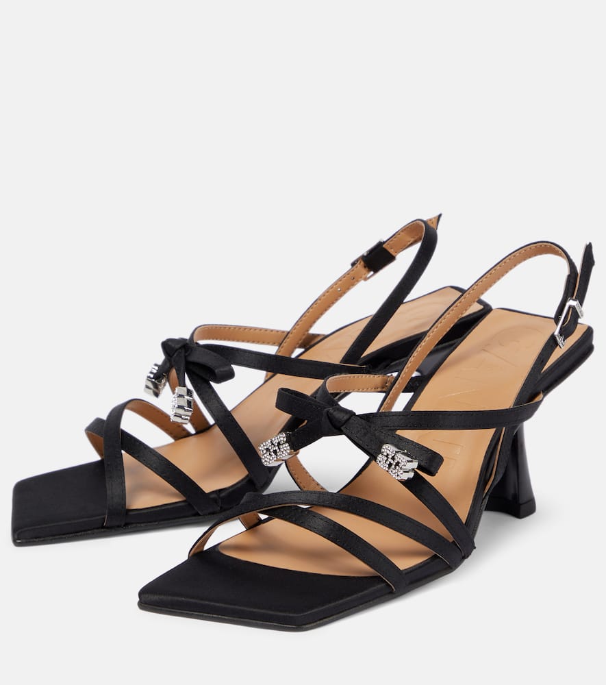 Upper: fabric. Lining: fabric. Sole: fabric insole, rubber sole. Toe shape: square open toe. Made in Spain. Designer color name: Black. Closure: buckle-fastening ankle strap. Comes with a box. Comes with dust bag. Shop the latest Ganni Mid-Heel Sandals for women now.