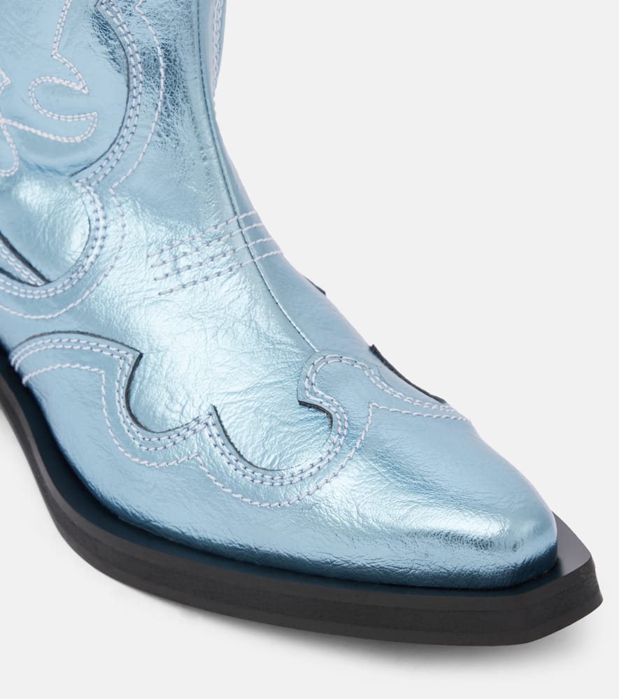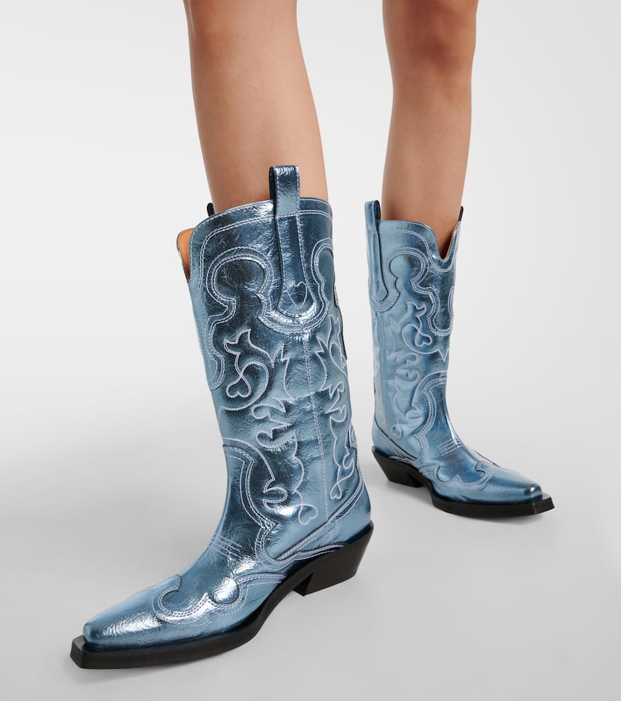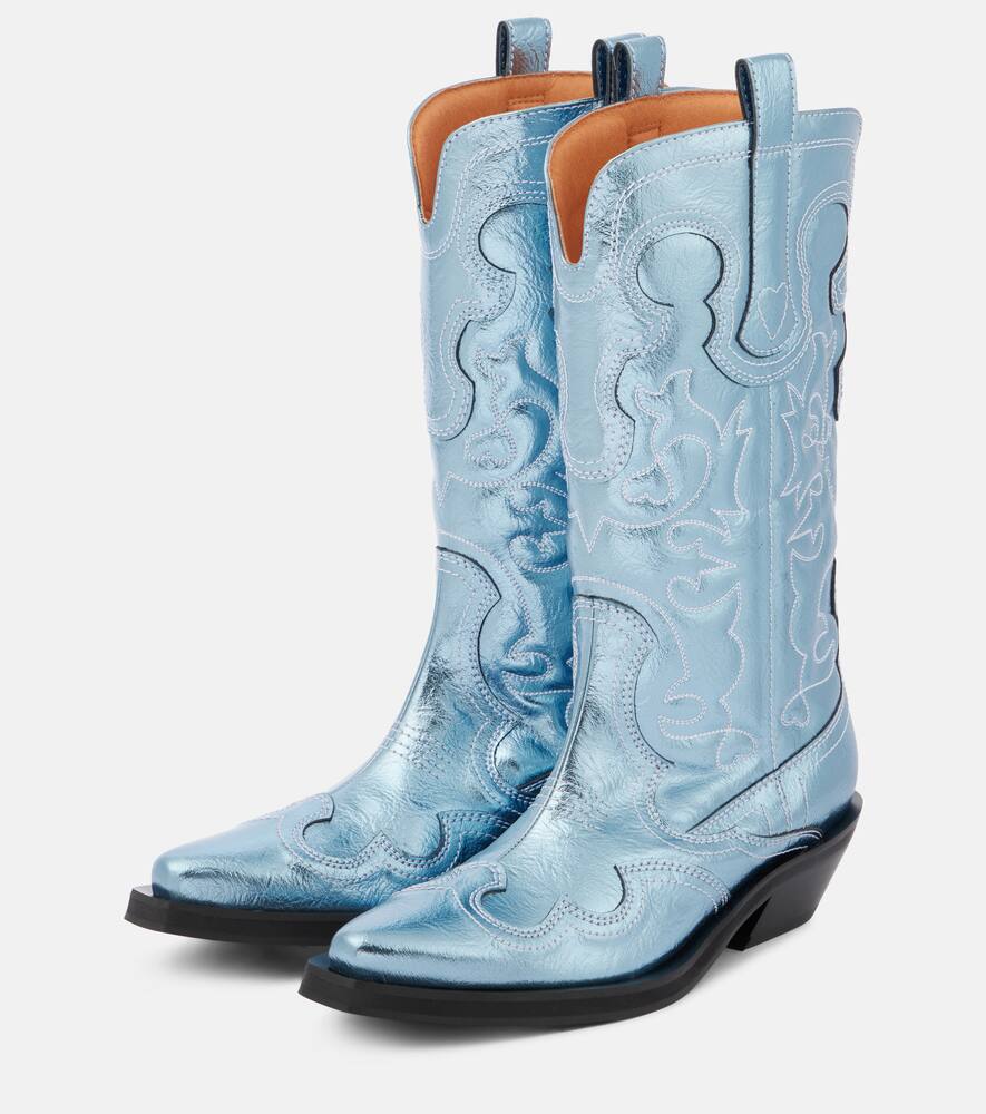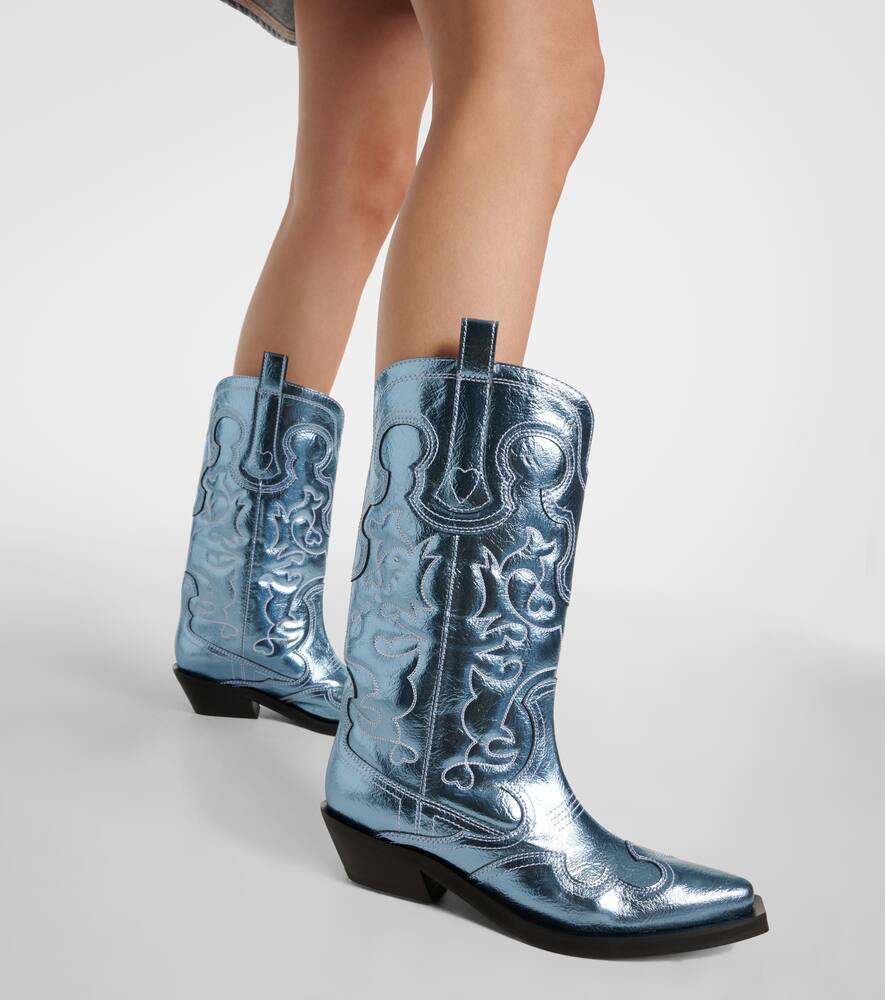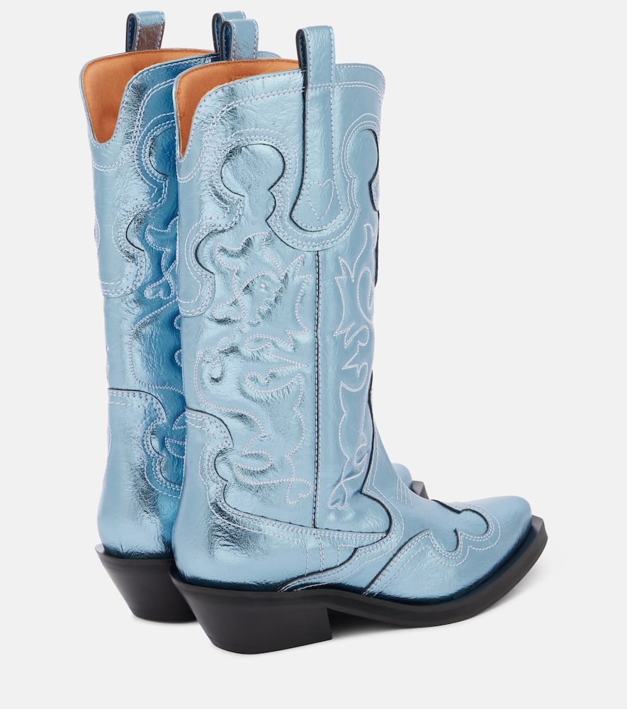 Upper: leather. Lining: leather. Sole: leather insole, rubber sole. Toe shape: pointed toe. Made in Portugal. Includes: shoe box. Designer color name: Blue Curacao. Shop the latest Ganni Mid-Heel Boots for women now.