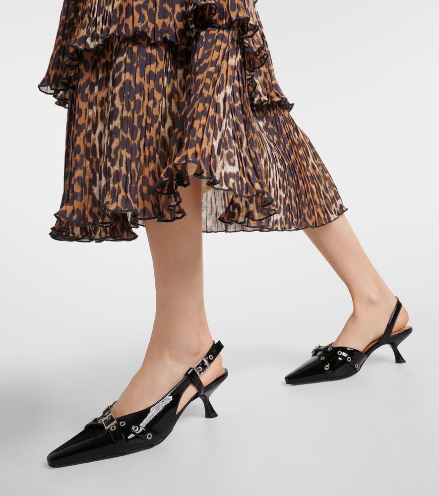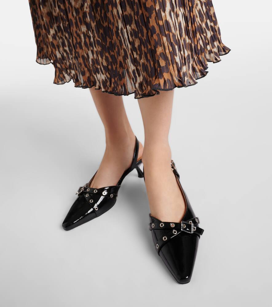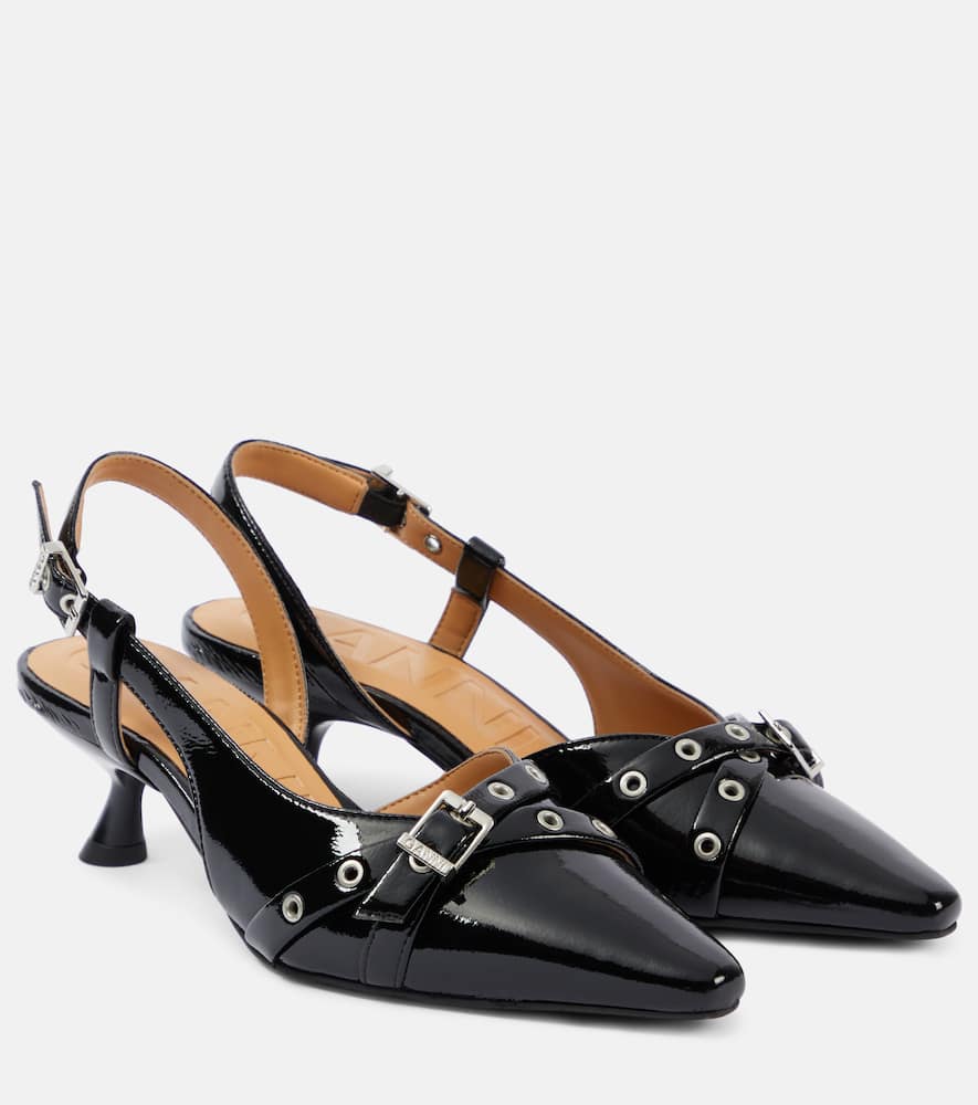 Upper: faux leather. Lining: fabric. Sole: leather insole and sole. Toe shape: pointed toe. Made in Portugal. Includes: shoe box, dust bag. Designer color name: Black. Closure: buckle-fastening ankle strap. Shop the latest Ganni Mid-Heel Pumps for women now.
