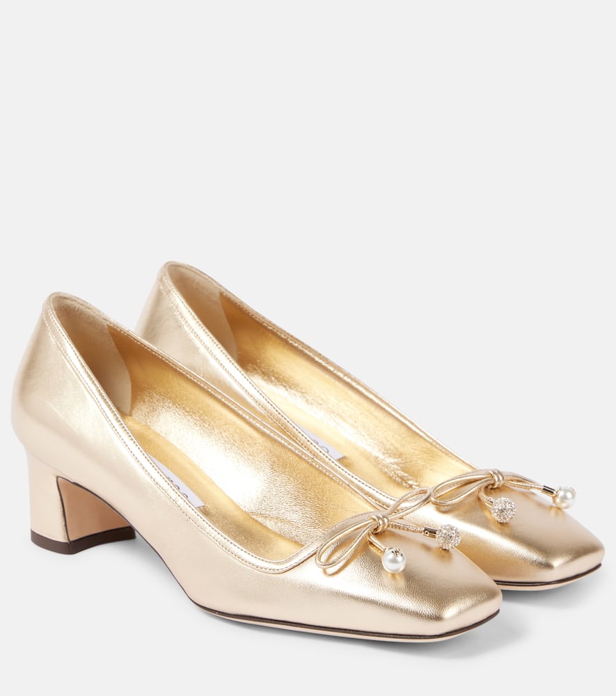 Upper: leather. Lining: leather. Sole: leather insole and sole. Toe shape: square toe. Made in Italy. Includes: dust bags, shoe box. Designer color name: Gold. Shop the latest Jimmy Choo Mid-Heel Pumps for women now.