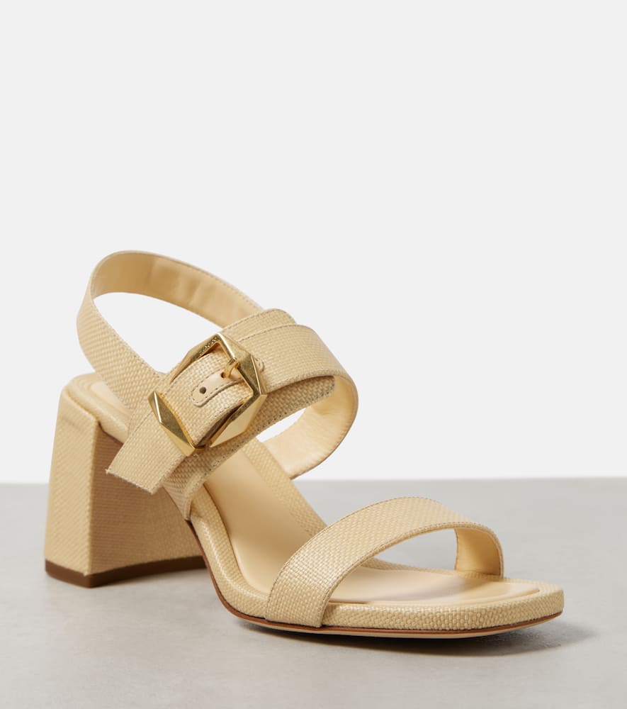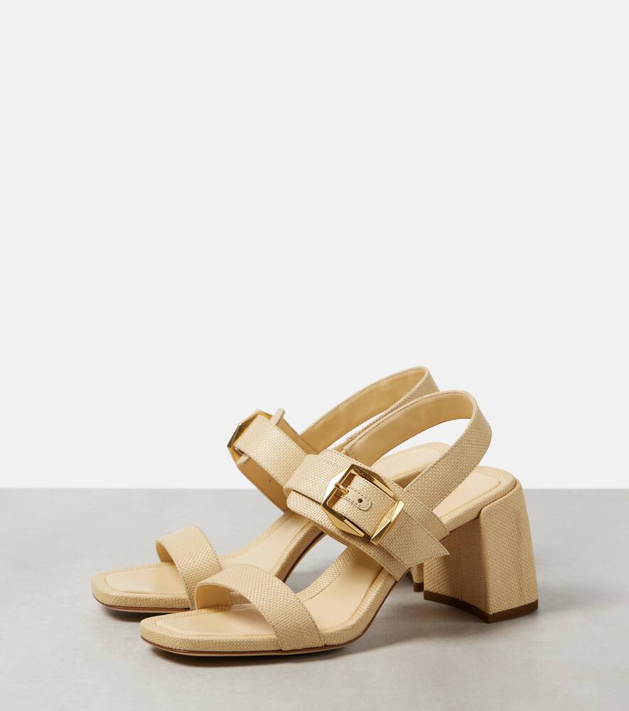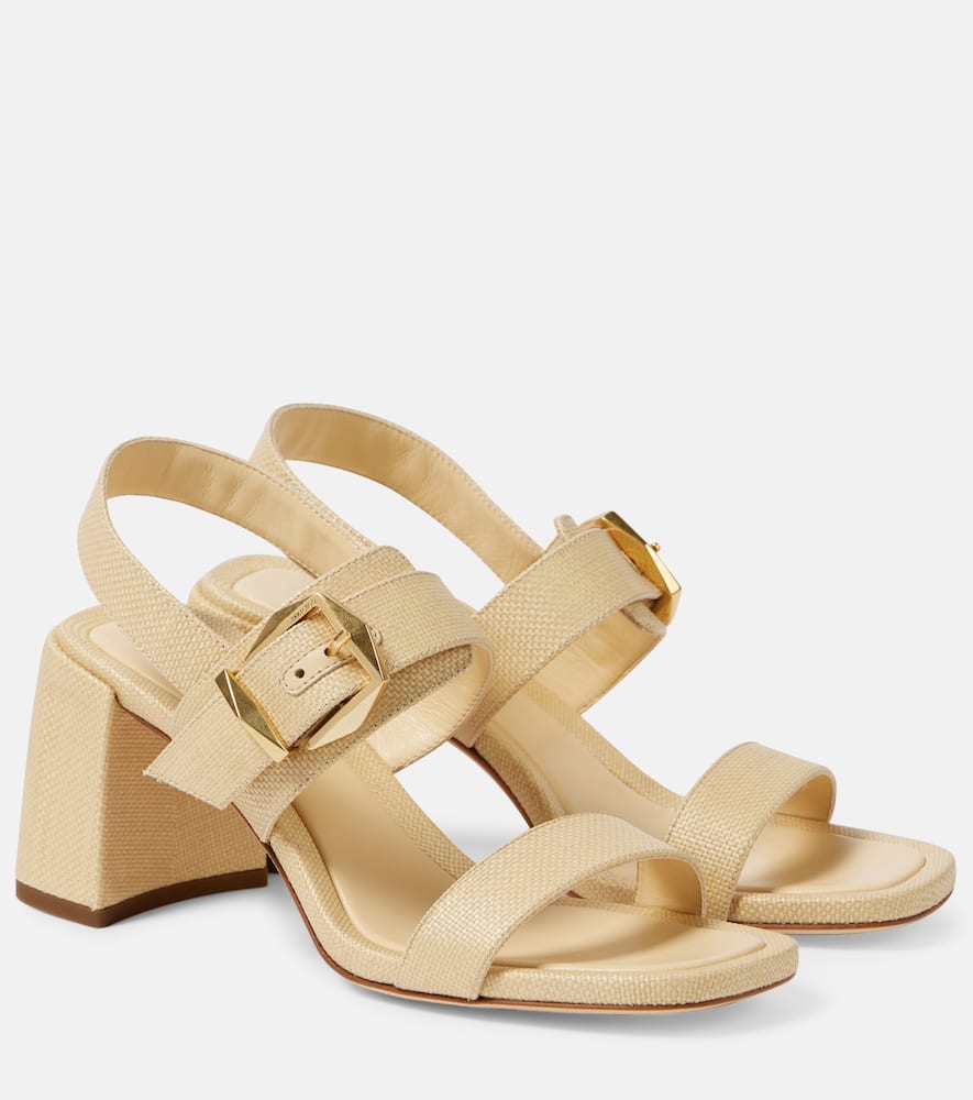 Upper: fabric. Lining: leather. Sole: leather insole, rubber sole. Toe shape: square open toe. Made in Italy. Includes: dust bags, shoe box. Designer color name: Natural/Gold. Trim: leather. Closure: buckle fastening. Hardware color: gold. Shop the latest Jimmy Choo Mid-Heel Sandals for women now.