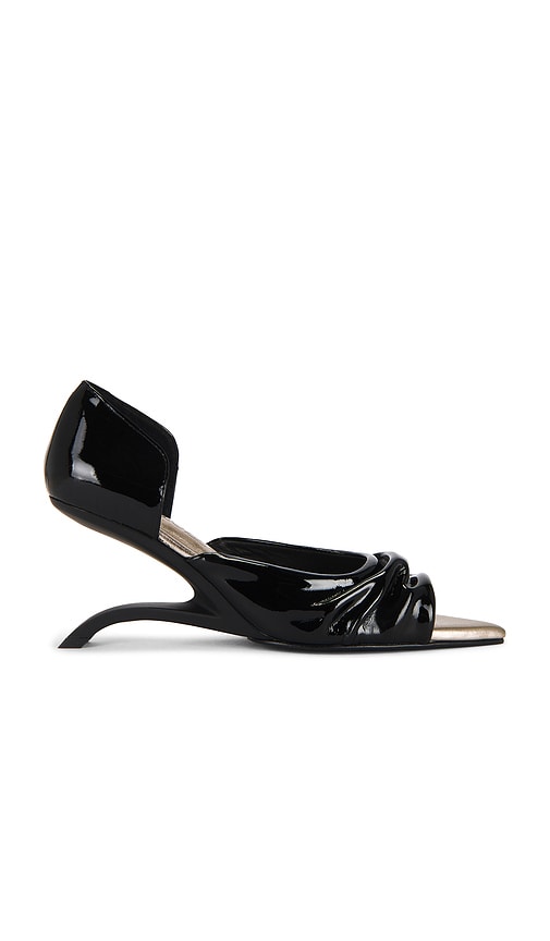 Patent leather upper with manmade sole. Slip-on styling. Leather footbed and lining. Pointed toe with structural wedge-like heel. Approx 74mm/ 2.95 inch heel. NLOZ-WZ16. ZCH2439. Color: Black. Shop Black Open Toe Heels for women and the latest Nora Lozza shoes now.