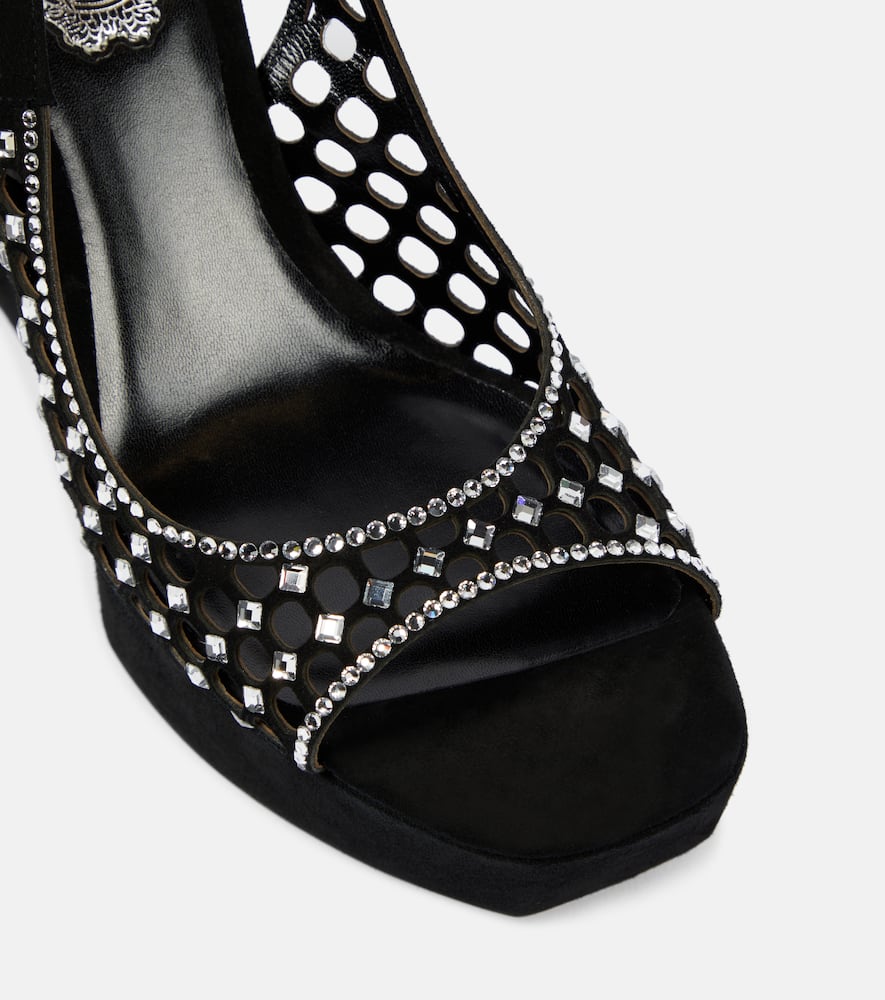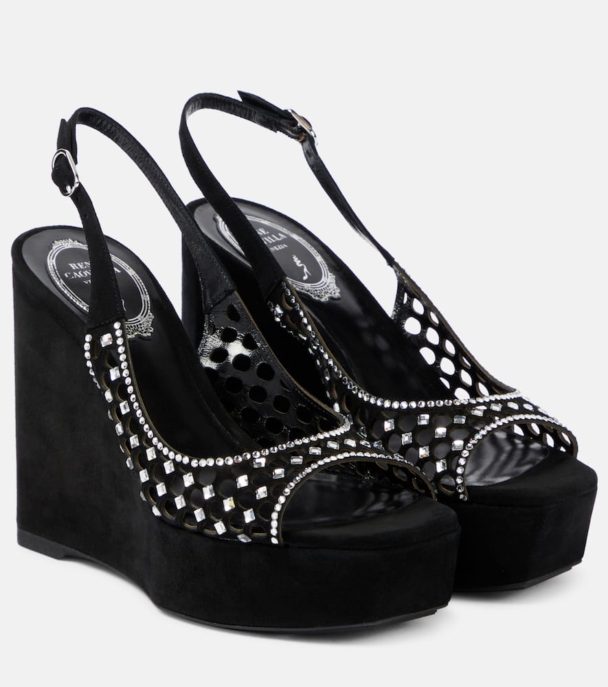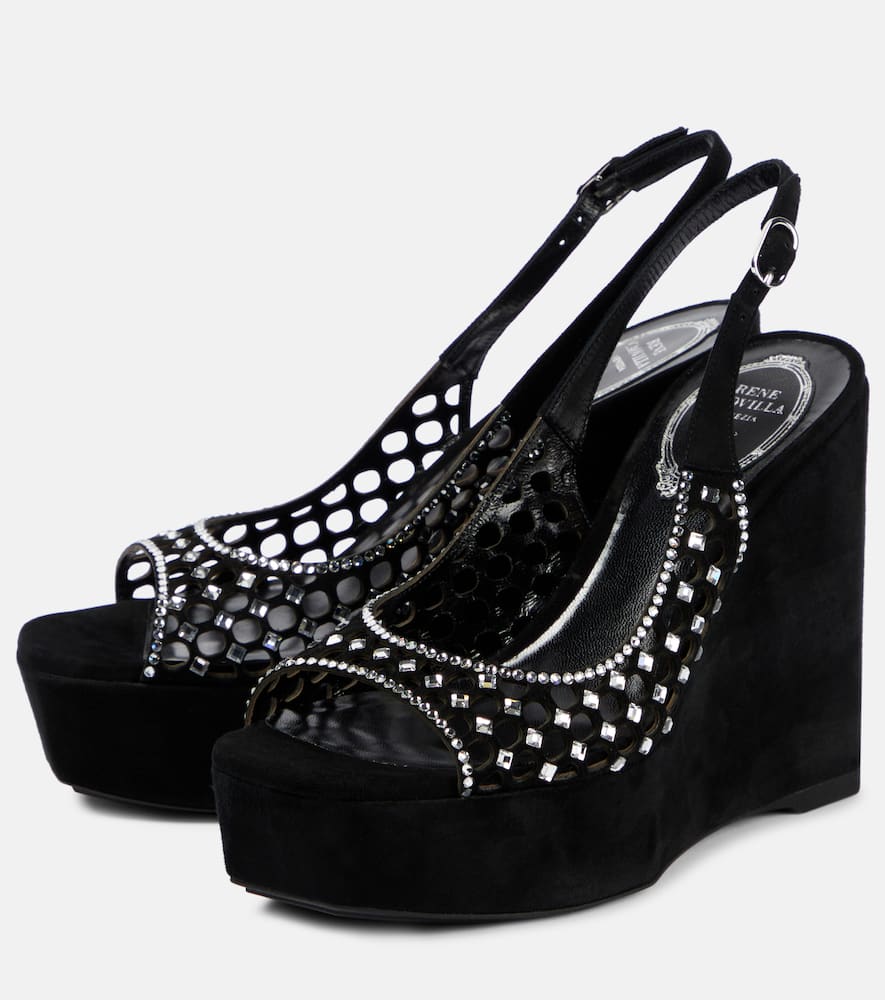 Upper: fabric. Lining: leather. Sole: leather insole, rubber sole. Toe shape: square open toe. Made in Italy. Includes: dust bag, shoe box. Designer color name: Black Suede/Crystal Strass. Closure: buckle fastening. Shop the latest Rene Caovilla Mid-Heel Sandals for women now.