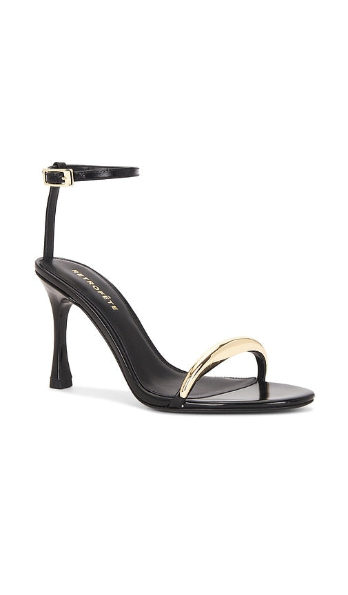 Leather upper with leather sole. Ankle buckle closure. Leather footbed and lining. Gold-tone metal hardware at vamp. Almond toe with stiletto heel. Approx 90mm/ 3.5 inch heel. ROFR-WZ47. R-FW25-11758-00. Retrofete, launched in 2018 by co-founders Ohad Seroya and Aviad Klin, embodies the glamour and opulence of decades past. Having gained notoriety for its sequin-clad party frocks, the New York-based label has evolved into a collection of daring, top-to-toe designs that seamlessly transform from day to night. Regardless of where she goes, you can count on the Retrofete girl to bring the party. Color: Black & Gold. Shop Black & Gold Open Toe Heels for women and the latest retrofete shoes now.