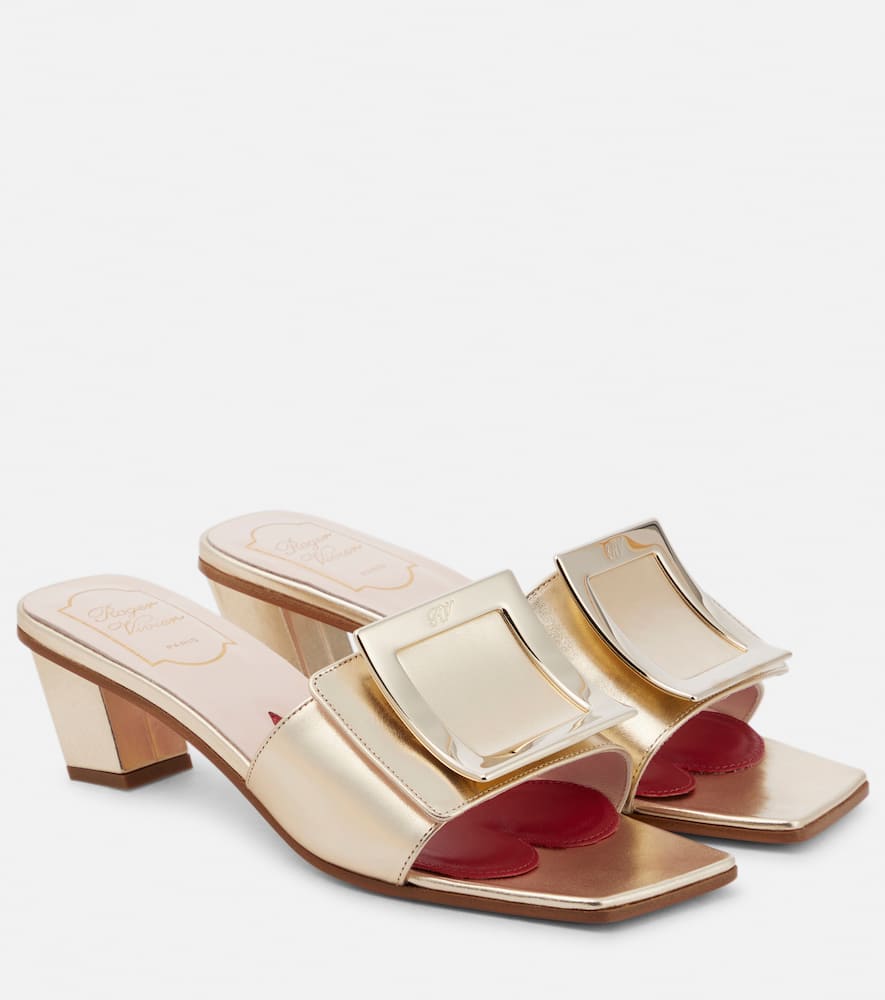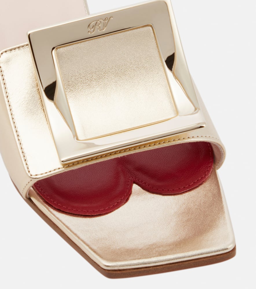 Lining: leather. Upper: calf leather. Sole: leather insole, leather and rubber sole. Toe shape: square open toe. Contains non-textile parts of animal origin. Designer color name: Oro Chiaro. Comes with a box. Made in Italy. Comes with dust bag. Shop the latest Roger Vivier Mid-Heel Sandals for women now.
