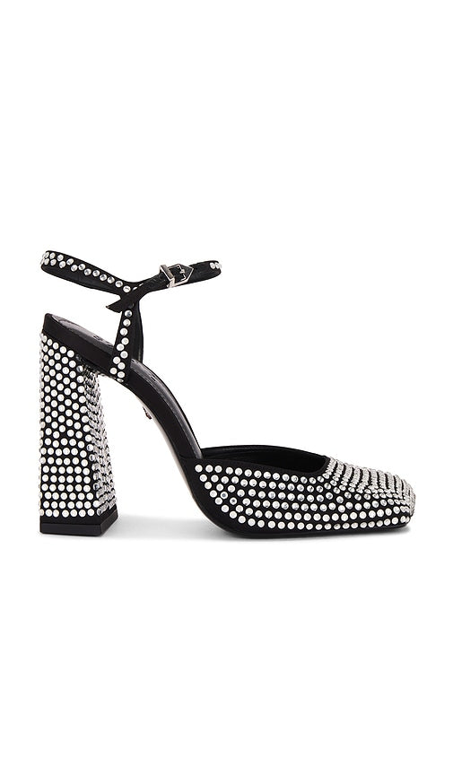 Crystal embellished satin upper with leather sole. Made in Brazil. Ankle buckle closure. Leather footbed and lining. Angled square toe with block heel. Approx 100mm/ 4 inch heel. SCHU-WZ1481. S2202900100001. Founded in 1995 by Alexandre Birman, Schutz has redefined attainable luxury, trend-forward footwear. With each new release, Schutz delivers the most of-the-moment collections that are the hero pieces around which entire outfits are built. Defined by confident, bold, and purpose-driven attitude, Schutz shoes lead the conversation, delivering fashion at your feet, one head-turning pair at a time. In her Schutz, she can conquer anything Color: Black. Shop Black Pump Heels for women and the latest Schutz shoes now.