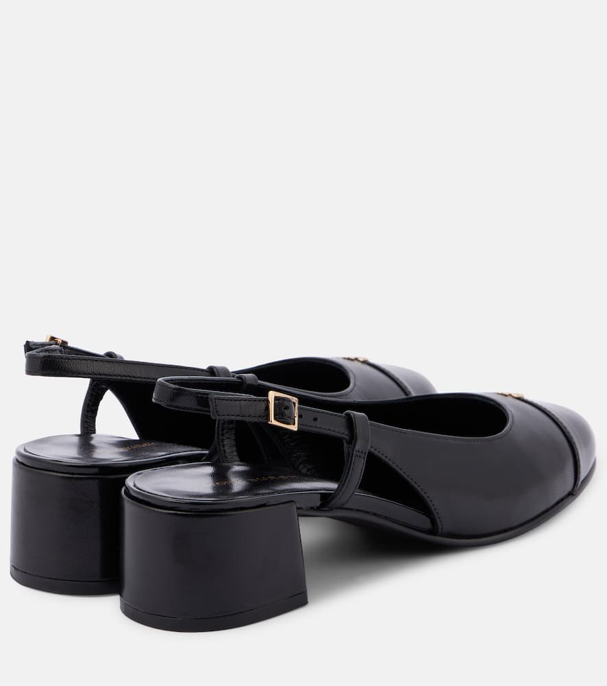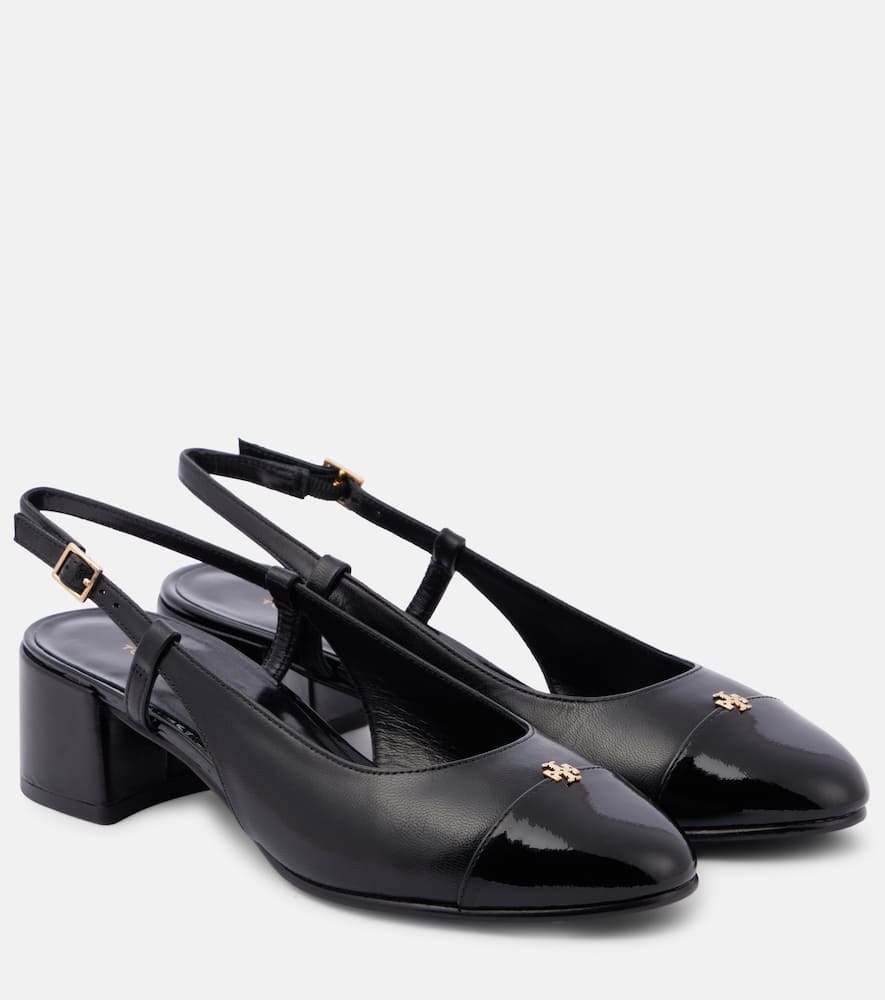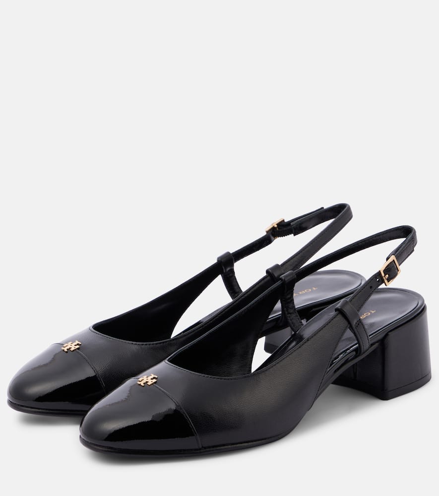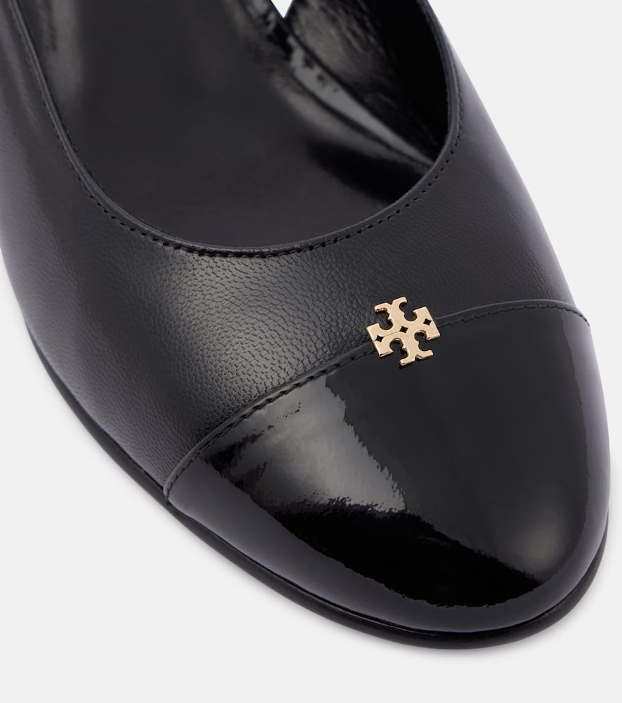 Upper: goat leather. Lining: leather. Sole: leather insole and sole. Toe shape: round toe. Made in Vietnam. Includes: shoe box, dust bag. Designer color name: Perfect Black/ Perfect Black. Trim: calf leather. Closure: buckle fastening. Shop the latest Tory Burch Mid-Heel Pumps for women now.