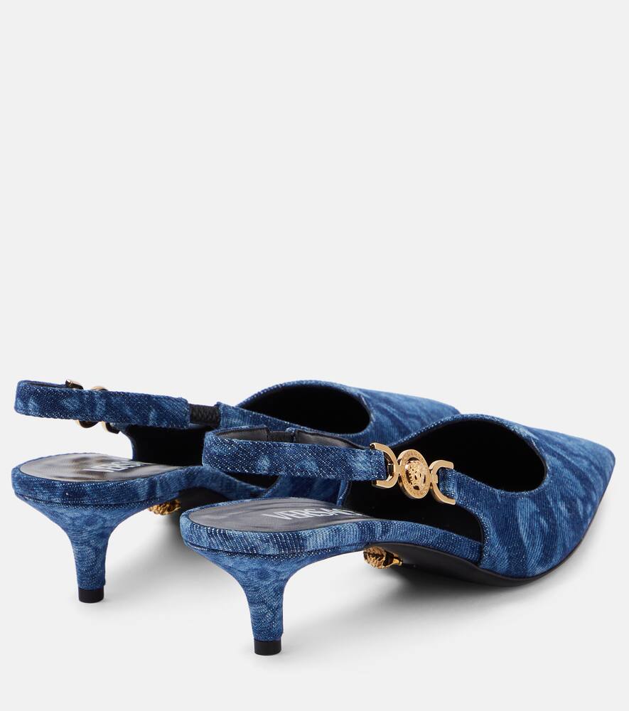 Upper: fabric. Lining: leather. Sole: leather insole and sole. Toe shape: pointed toe. Made in Italy. Includes: dust bags, shoe box. Designer color name: Blue-Versace Gold. Shop the latest Versace Mid-Heel Pumps for women now.