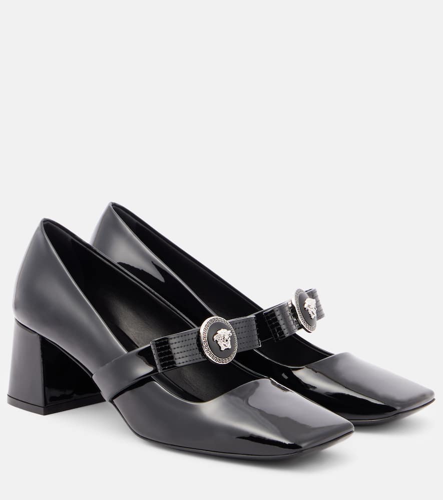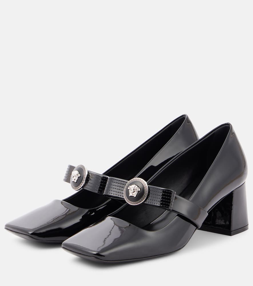 Upper: leather. Lining: leather. Sole: leather insole and sole. Toe shape: square toe. Made in Italy. Includes: dust bags, shoe box. Designer color name: Black-Palladium. Shop the latest Versace Mid-Heel Pumps for women now.