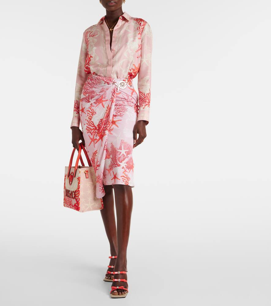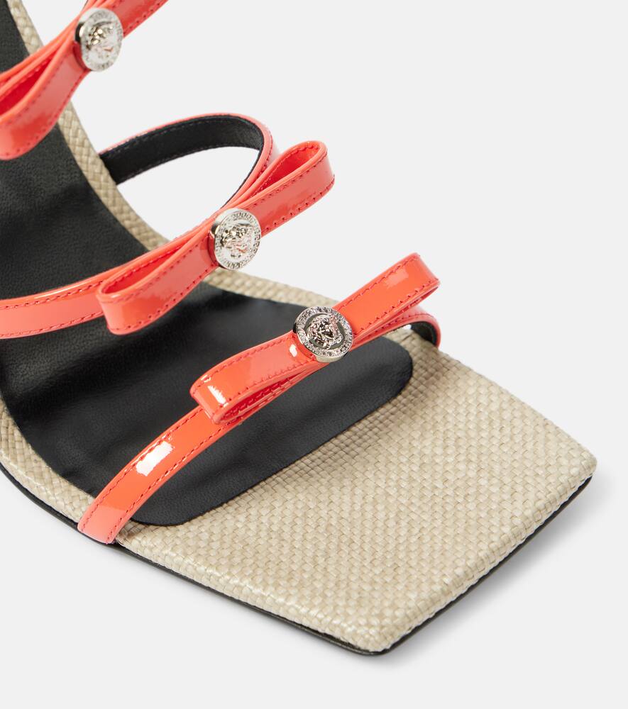Upper: calf leather. Lining: leather. Sole: leather insole and sole. Toe shape: square open toe. Made in Italy. Includes: shoe box, dust bag. Designer color name: Coral-Palladium. Shop the latest Versace High-Heel Sandals for women now.