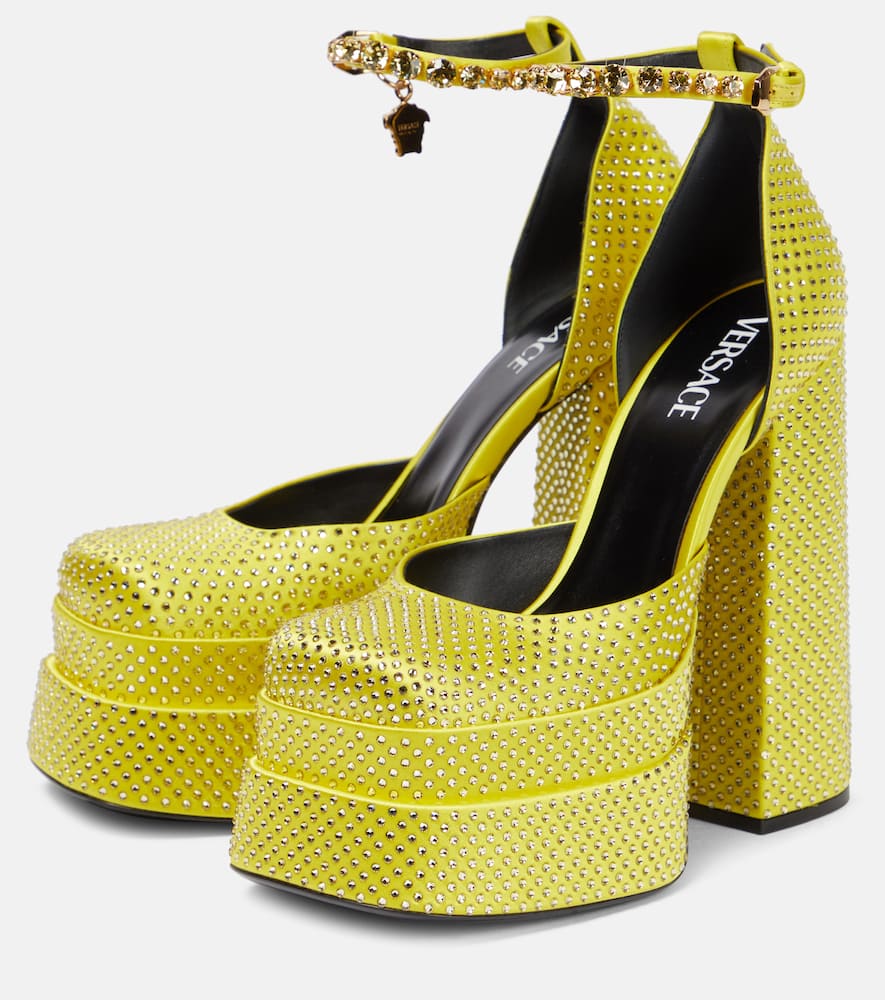 Lining: leather. Upper: fabric. Sole: leather insole and sole. Toe shape: square toe. Comes with dust bags. Designer color name: Mimosa - Versace Gold. Closure: buckle-fastening ankle strap. Made in Italy. Shop the latest Versace High-Heel Pumps for women now.