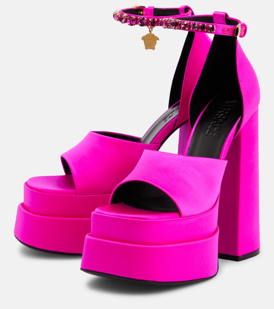 Sole: leather insole, leather and rubber sole. Lining: fabric. Comes with a box. Made in Italy. Upper: fabric. Designer color name: Deep Fuxia-Oro Versace. Comes with dust bags. Toe shape: square open toe. Closure: buckle-fastening ankle strap. Shop the latest Versace High-Heel Sandals for women now.
